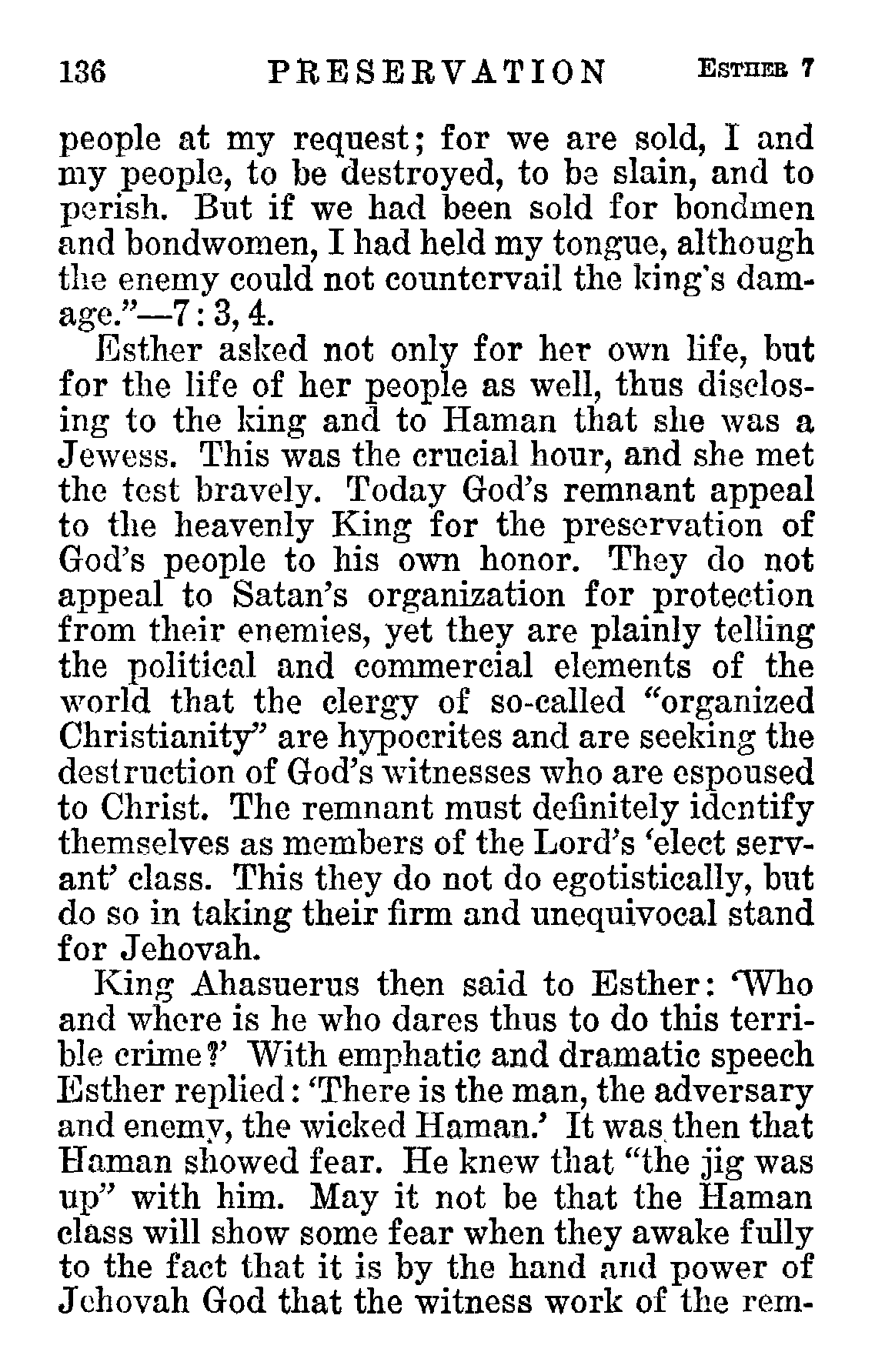 136 PRESERVATION Esrume 7 people at my request; for we are sold, I and my people, to be destroyed, to ba slain, and to perish. But if we had been sold for bondmen and bondwomen, I had held my tongue, although the enemy could not countervail the king’s damage.”—7 : 8, 4. Ksther asked not only for her own life, but for the life of her people as well, thus disclosing to the king and to Haman that she was a Jewess. This was the crucial hour, and she met the test bravely. Today God’s remnant appeal to the heavenly King for the preservation of God’s people to his own honor. They do not appeal to Satan’s organization for protection from their enemies, yet they are plainly telling the political and commercial elements of the world that the clergy of so-called “organized Christianity” are hypocrites and are seeking the destruction of God’s witnesses who are espoused to Christ. The remnant must definitely identify themselves as members of the Lord’s ‘elect servant’ class. This they do not do egotistically, but do so in taking their firm and unequivocal stand for Jehovah. King Ahasuerus then said to Esther: ‘Who and where is he who dares thus to do this terrible crime? With emphatic and dramatic speech Iisther replied: “There is the man, the adversary and enemy, the wicked Haman.’ It was then that Haman showed fear. He knew that “the jig was up” with him. May it not be that the Haman class will show some fear when they awake fully to the fact that it is by the hand and power of Jchovah God that the witness work of the rem