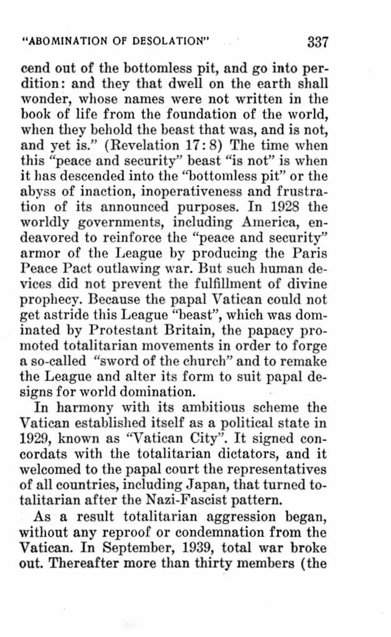 “ABOMINATION OF DESOLATION” 337 cend out of the bottomless pit, and go into perdition: and they that dwell on the earth shall wonder, whose names were not written in the book of life from the foundation of the world, when they behold the beast that was, and is not, and yet is.” (Revelation 17:8) The time when this “peace and security” beast “is not” is when it has descended into the “bottomless pit” or the abyss of inaction, inoperativeness and frustration of its announced purposes. In 1928 the worldly governments, including America, endeavored to reinforce the “peace and security” armor of the League by producing the Paris Peace Pact outlawing war. But such human devices did not prevent the fulfillment of divine prophecy. Because the papal Vatican could not get astride this League “beast”, which was dominated by Protestant Britain, the papacy promoted totalitarian movements in order to forge a so-called “sword of the church” and to remake the League and alter its form to suit papal designs for world domination. In harmony with its ambitious scheme the Vatican established itself as a political state in 1929, known as “Vatican City”. It signed concordats with the totalitarian dictators, and it welcomed to the papal court the representatives of all countries, including Japan, that turned totalitarian after the Nazi-Fascist pattern. As a result totalitarian aggression began, without any reproof or condemnation from the Vatican. In September, 1939, total war broke out. Thereafter more than thirty members (the
