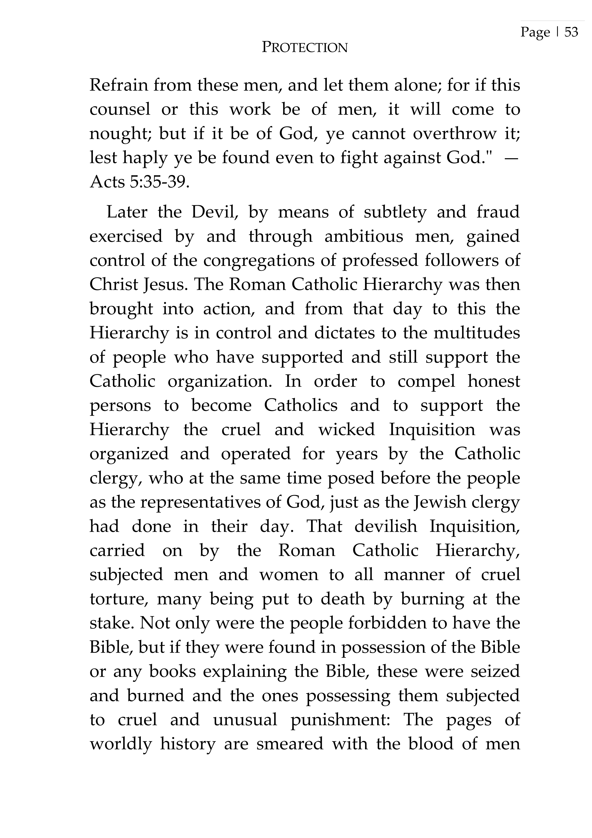 PROTECTION Refrain from these men, and let them alone; for if this counsel or this work be of men, it will come to nought; but if it be of God, ye cannot overthrow it; lest haply ye be found even to fight against God." — Acts 5:35-39. Later the Devil, by means of subtlety and fraud exercised by and through ambitious men, gained control of the congregations of professed followers of Christ Jesus. The Roman Catholic Hierarchy was then brought into action, and from that day to this the Hierarchy is in control and dictates to the multitudes of people who have supported and still support the Catholic organization. In order to compel honest persons to become Catholics and to support the Hierarchy the cruel and wicked Inquisition was organized and operated for years by the Catholic clergy, who at the same time posed before the people as the representatives of God, just as the Jewish clergy had done in their day. That devilish Inquisition, carried on by the Roman Catholic Hierarchy, subjected men and women to all manner of cruel torture, many being put to death by burning at the stake. Not only were the people forbidden to have the Bible, but if they were found in possession of the Bible or any books explaining the Bible, these were seized and burned and the ones possessing them subjected to cruel and unusual punishment: The pages of worldly history are smeared with the blood of men Page | 53