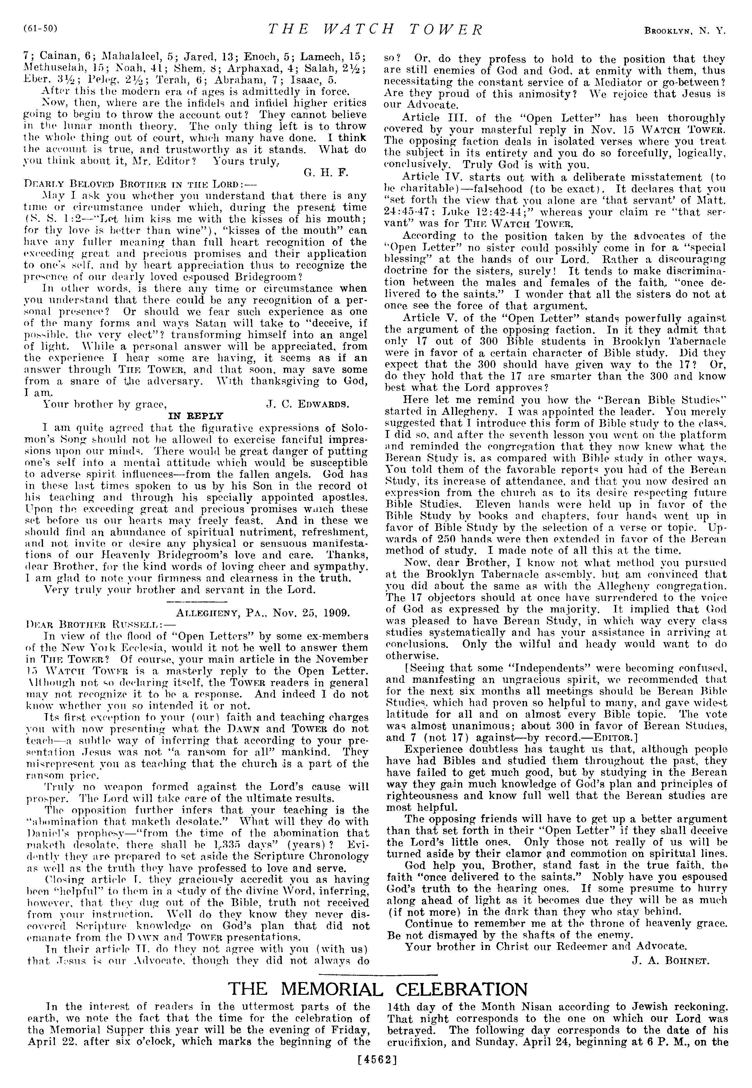 (61-50) THE 7; Cainan, 6; Mahalalcel, 5; Jared, 13; Enoch, 5; Lamech, 15; Methuselah, 15; Noah, 41; Shem, 3; Arphaxad, 4; Salah, 2%; Eber. 344; Peleg, 21%; Terah, 6; Abraham, 7; Isaac, 5. After this the modern era of ages is admittedly in force. Now, then, where are the infidels and infidel higher critics going to begin to throw the account out? They cannot believe in the lunar month theory. The only thing left is to throw the whole thing out of court, which many have done. I think the account is true, and trustworthy as it stands. What do you think about it, Mr. Editor? Yours truly, G. H. F. Drarity BELOvED Brorier IN THE Lorp:— May I ask you whether you understand that there is any time or circumstance under which, during the present time (S. S. 1:2—"Let him kiss me with the kisses of his mouth; for thy love is better than wine”), “kisses of the mouth” can have any fuller meaning than full heart recognition of the exceeding great and precious promises and their application to one’s self, and by heart appreciation thus to recognize the presence of our dearly loved espoused Bridegroom? In other words, 1s there any time or circumstance when you understand that there could be any recognition of a personal presence? Or should we fear such experience as one of the many forms and ways Satan will take to “deceive, if possible, the very elect”? transforming himself into an angel of light. While a personal answer will be appreciated, from the experience I hear some are having, it seems as if an answer through Tur Tower, and that soon, may save some from a snare of the adversary. With thanksgiving to God, I am, Your brother by grace, IN REPLY I am quite agreed that the figurative expressions of Solomon’s Song should not he allowed to exercise fanciful impressions upon our minds. There would be great danger of putting one’s self into a mental attitude which would be susceptible to adverse spirit influences—from the fallen angels. God has in these last times spoken to us by his Son in the record ot his teaching and through his specially appointed apostles. Upon the exceeding great and precious promises wuich these set before us our hearts may freely feast. And in these we should find an abundance of spiritual nutriment, refreshment, and not invite or desire any physical or sensuous manifestations of our Heavenly Bridegroom’s love and care. ‘Thanks, dear Brother, for the kind words of loving cheer and sympathy. Iam glad to note your firmness and clearness in the truth. Very truly your brother and servant in the Lord. J. C. EnwARDS. ALLEGHENY, Pa., Nov. 25, 1909. Dear Brorner RUSSELL :— In view of the flood of “Open Letters” by some ex-members of the New York Ecclesia, would it not be well to answer them in Tie Tower? Of course, your main article in the November 15 Warcr Towrr is a masterly reply to the Open Letter. Although not so declaring itself, the Tower readers in general may not recognize it to be a response. And indeed I do not know whether you so intended it or not. Tts first exception to your (our) faith and teaching charges you with now presenting what the Dawn and Tower do not teach—a subtle way of inferring that according to your presentation Jesus was not ‘fa ransom for all” mankind. They misrepresent you as teaching that the church is a part of the ransom price. Truly no weapon formed against the Lord’s cause will prosper. The Lord will take care of the ultimate results. The opposition further infers that your teaching is the “abomination that maketh desolate.” What will they do with Daniel's prophesy—‘from the time of the abomination that maketh desolate, there shall be 1.8385 davs” (years)? Evidently they are prepared to set aside the Scripture Chronology as well as the truth they have professed to love and serve. Closing article T. they graciously accredit you as having heen “helpful” to them in a study of the divine Word, inferring, however, that they dug out of the Bible, truth not received from your instruction. Well do they know they never discovered Scripture knowledge on God’s plan that did not emanate from the Daww and Tower presentations. Tn their article TT. do they not agree with you (with us) that TJosus is our Advocate, though they did not always do WATCH TOWER Brooxiyn, N. Y. so? Or, do they profess to hold to the position that they are still enemies of God and God, at enmity with them, thus necessitating the constant service of a Mediator or go-between? Are they proud of this animosity? We rejoice that Jesus is our Advocate. Article III. of the “Open Letter” has been thoroughly covered by your masterful reply in Nov. 15 Warcn ‘Tower. The opposing faction deals in isolated verses where you treat the subject in its entirety and you do so forcefully, logically, conclusively, Truly God is with you. Article IV. starts out with a deliberate misstatement (to be charitable)—falsehood (to be exact). It declares that you “set forth the view that you alone are ‘that servant’ of Matt. 24:45-47; Tike 12:42-44;” whereas your claim re “that servant” was for Toe Watcu Tower, According to the position taken by the advocates of the “Open Letter” no sister could possibly come in for a “special blessing” at the hands of our Lord. Rather a discouraging doctrine for the sisters, surely! It tends to make discrimination hetween the males and females of the faith, ‘‘once delivered to the saints.” I wonder that all the sisters do not at once see the force of that argument. Article V. of the “Open Letter” stands powerfully against the argument of the opposing faction. In it they admit that only 17 out of 300 Bible students in Brooklyn ‘labernacle were in favor of a certain character of Bible study. Did they expect that the 300 should have given way to the 17? Or, do they hold that the 17 are smarter than the 300 and know best what the Lord approves? Here let me remind you how the “Berean Bible Studi