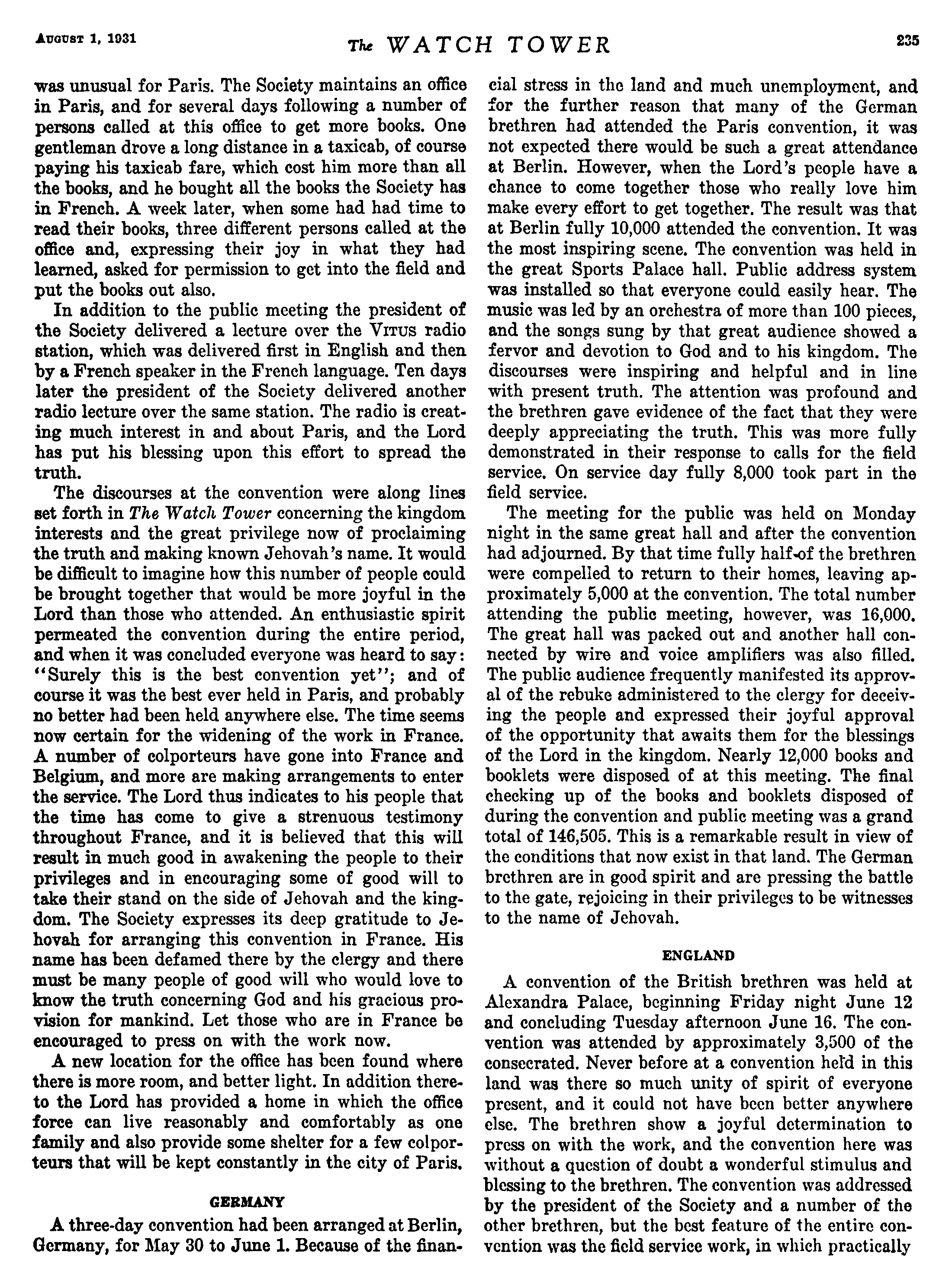 Avcust 1, 1931 ‘was unusual for Paris. The Society maintains an office in Paris, and for several days following a number of persons called at this office to get more books. One gentleman drove a long distance in a taxicab, of course paying his taxicab fare, which cost him more than all the books, and he bought all the books the Society has in French. A week later, when some had had time to read their books, three different persons called at the office and, expressing their joy in what they had learned, asked for permission to get into the field and put the books out also. In addition to the public meeting the president of the Society delivered a lecture over the Virus radio station, which was delivered first in English and then by a French speaker in the French language. Ten days later the president of the Society delivered another radio lecture over the same station. The radio is creating much interest in and about Paris, and the Lord has put his blessing upon this effort to spread the truth, The discourses at the convention were along lines set forth in The Watch Tower concerning the kingdom interests and the great privilege now of proclaiming the truth and making known Jehovah’s name. It would be difficult to imagine how this number of people eould be brought together that would be more joyful in the Lord than those who attended. An enthusiastie spirit permeated the convention during the entire period, and when it was concluded everyone was heard to say: “Surely this is the best convention yet’’; and of course it was the best ever held in Paris, and probably no better had been held anywhere else. The time seems now certain for the widening of the work in France. A number of colporteurs have gone into France and Belgium, and more are making arrangements to enter the service. The Lord thus indicates to his people that the time has come to give a strenuous testimony throughout France, and it is believed that this will result in much good in awakening the people to their privileges and in encouraging some of good will to take their stand on the side of Jehovah and the kingdom. The Society expresses its deep gratitude to Jehovah for arranging this convention in France. His name has been defamed there by the clergy and there must be many people of good will who would love to know the truth concerning God and his gracious provision for mankind. Let those who are in France be encouraged to press on with the work now. A new location for the office has been found where there is more room, and better light. In addition thereto the Lord has provided a home in which the office force can live reasonably and comfortably as one family and also provide some shelter for a few colporteurs that will be kept constantly in the city of Paris, GERMANY A three-day convention had been arranged at Berlin, Germany, for May 30 to June 1. Because of the finan Te WATCH TOWER 235 cial stress in the land and much unemployment, and for the further reason that many of the German brethren had attended the Paris convention, it was not expected there would be such a great attendance at Berlin. However, when the Lord’s people have a chance to come together those who really love him make every effort to get together. The result was that at Berlin fully 10,000 attended the convention. It was the most inspiring scene. The convention was held in the great Sports Palace hall. Public address system was installed so that everyone could easily hear. The music was led by an orchestra of more than 100 pieces, and the songs sung by that great audience showed a fervor and devotion to God and to his kingdom. The discourses were inspiring and helpful and in line with present truth. The attention was profound and the brethren gave evidence of the fact that they were deeply appreciating the truth. This was more fully demonstrated in their response to calls for the field service, On service day fully 8,000 took part in the field service. The meeting for the public was held on Monday night in the same great hall and after the convention had adjourned. By that time fully half-of the brethren were compelled to return to their homes, leaving approximately 5,000 at the convention. The total number attending the publie meeting, however, was 16,000. The great hall was packed out and another hall connected by wire and voice amplifiers was also filled. The public audience frequently manifested its approval of the rebuke administered to the clergy for deceiving the people and expressed their joyful approval of the opportunity that awaits them for the blessings of the Lord in the kingdom. Nearly 12,000 books and booklets were disposed of at this meeting. The final checking up of the books and booklets disposed of during the convention and public meeting was a grand total of 146,505. This is a remarkable result in view of the conditions that now exist in that Jand. The German brethren are in good spirit and are pressing the battle to the gate, rejoicing in their privileges to be witnesses to the name of Jehovah. ENGLAND A convention of the British brethren was held at Alexandra Palace, beginning Friday night June 12 and concluding Tuesday afternoon June 16. The convention was attended by approximately 3,500 of the eonsecrated. Never before at a convention held in this land wag there so much unity of spirit of everyone present, and it could not have been better anywhere else. The brethren show a joyful determination to press on with the work, and the convention here was without a question of doubt a wonderful stimulus and blessing to the brethren, The convention was addressed by the president of the Society and a number of the other brethren, but the best feature of the entire convention was the ficld service work, in which practically