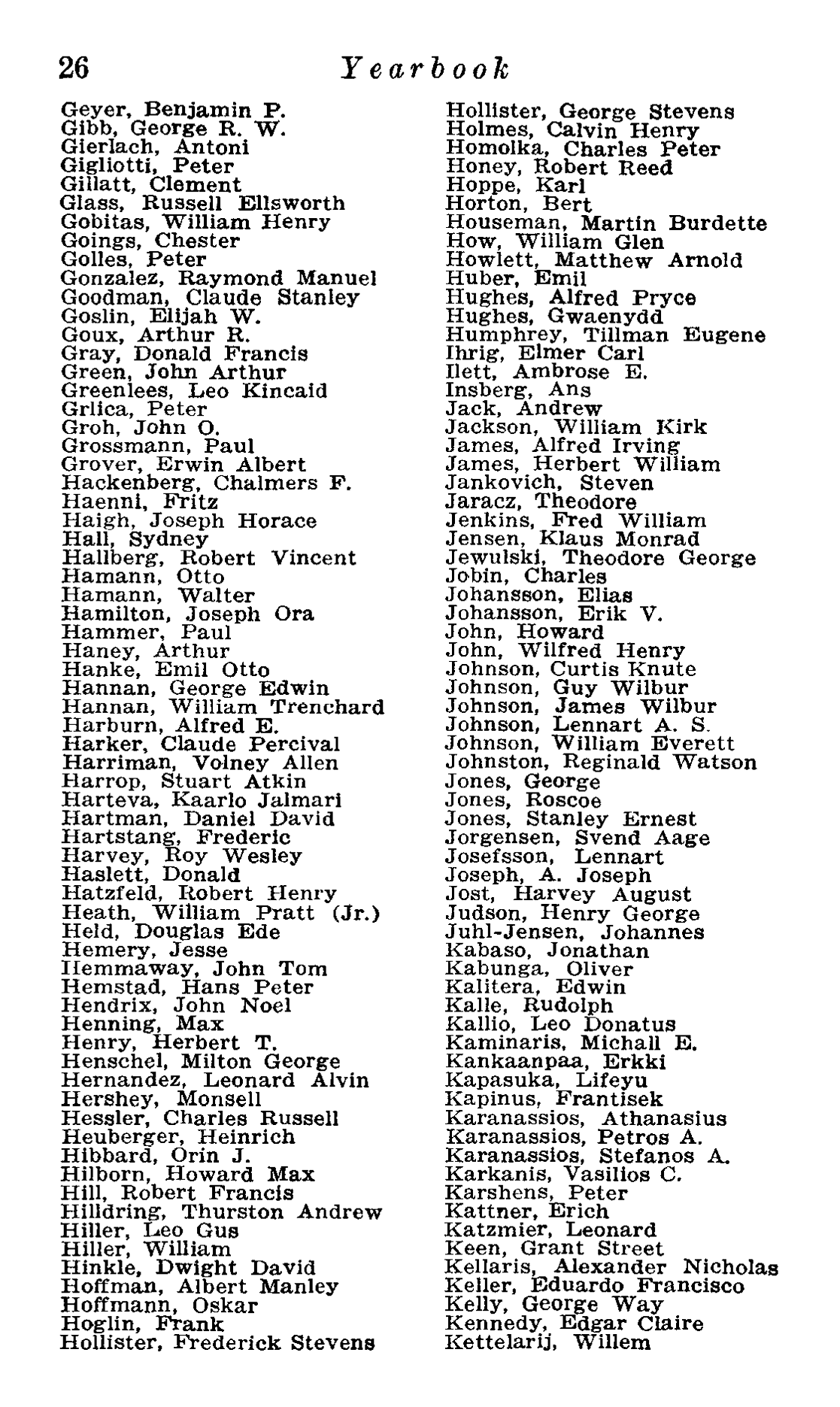 26 Yearbook Geyer, Benjamin P. Gibb, George R. W. Gierlach, Antoni Gigliotti, Peter Gillatt, Clement Glass, Russell Ellsworth Gobitas, William Henry Goings, Chester Golles, Peter Gonzalez, Raymond Manuel Goodman, Claude Stanley Goslin, Elijah W. Goux, Arthur R. Gray, Donald Francis Green, John Arthur Greenlees, Leo Kincaid Grlica, Peter Groh, John O., Grossmann, Paul Grover, Erwin Albert Hackenberg, Chalmers F. Haenni, Fritz Haigh, Joseph Horace Hall, Sydney . Hallberg, Robert Vincent Hamann, Otto Hamann, Walter Hamilton, Joseph Ora Hammer, Paul Haney, Arthur Hanke, Emil Otto Hannan, George Edwin Hannan, William Trenchard Harburn, Alfred E. Harker, Claude Percival Harriman, Volney Allen Harrop, Stuart Atkin Harteva, Kaarlo Jalmari Hartman, Daniel David Hartstang, Frederic Harvey, Roy Wesley Haslett, Donald Hatzfeld, Robert Henry Heath, William Pratt (Jr.) Held, Douglas Ede Hemery, Jesse Iiemmaway, John Tom Hemstad, Hans Peter Hendrix, John Noel Henning, Max Henry, Herbert T. Henschel, Milton George Hernandez, Leonard Alvin Hershey, Monsell Hessler, Charles Russell Heuberger, Heinrich Hibbard, Orin J. Hilborn, Howard Max Hill, Robert Francis Hilldring, Thurston Andrew Hiller, Leo Gus Hiller, William Hinkle, Dwight David Hoffman, Albert Manley Hoffmann, Oskar Hoglin, Frank Hollister, Frederick Stevens Hollister, George Stevens Holmes, Calvin Henry Homolka, Charles Peter Honey, Robert Reed Hoppe, Karl Horton, Bert Houseman, Martin Burdette How, William Glen Howlett, Matthew Arnold Huber, Emil Hughes, Alfred Pryce Hughes, Gwaenydd Humphrey, Tillman Eugene Thrig, Elmer Carl lett, Ambrose EB, Insberg, Ans Jack, Andrew Jackson, William Kirk James, Alfred Irving James, Herbert William Jankovich, Steven Jaracz, Theodore Jenkins, Fred William Jensen, Klaus Monrad Jewulski, Theodore George Jobin, Charles Johansson, Elias Johansson, Erik V. John, Howard John, Wilfred Henry Johnson, Curtis Knute Johnson, Guy Wilbur Johnson, James Wilbur Johnson, Lennart A. S. Johnson, William Everett Johnston, Reginald Watson Jones, George Jones, Roscoe Jones, Stanley Ernest Jorgensen, Svend Aage Josefsson, Lennart Joseph, A. Joseph Jost, Harvey August Judson, Henry George Juhl-Jensen, Johannes Kabaso, Jonathan Kabunga, Oliver Kalitera, Edwin Kalle, Rudolph Kallio, Leo Donatus Kaminaris, Michall E. Kankaanpaa, Erkki Kapasuka, Lifeyu Kapinus, Frantisek Karanassios, Athanasius Karanassios, Petros A. Karanassios, Stefanos A. Karkanis, Vasilios C. Karshens, Peter Kattner, Erich Katzmier, Leonard Keen, Grant Street Kellaris, Alexander Nicholas Keller, Eduardo Francisco Kelly, George Way Kennedy, Edgar Claire Kettelarij, Willem