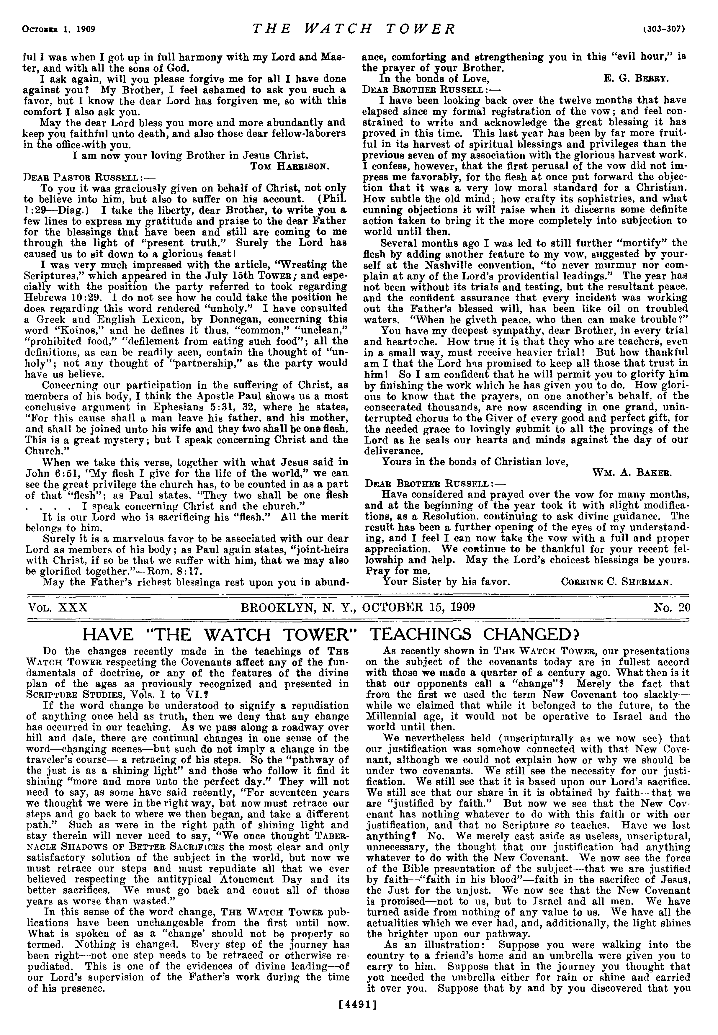 Octoser 1, 1909 ful I was when I got up in full harmony with my Lord and Master, and with all the sons of God. I ask again, will you please forgive me for all I have done against you? My Brother, I feel ashamed to ask you such a favor, but I know the dear Lord has forgiven me, so with this comfort I also ask you. May the dear Lord bless you more and more abundantly and keep you faithful unto death, and also those dear fellow-laborers in the office-with you. I am now your loving Brother in Jesus Christ, Tom Hagpison. DeEaR PaSTOR RUSSELL :— To you it was graciously given on behalf of Christ, not only to believe into him, but also to suffer on his account. (Phil. 1:29—Diag.) I take the liberty, dear Brother, to write you a few lines to express my gratitude and praise to the dear Father for the blessings that have been and still are coming to me through the light of “present truth.” Surely the Lord has caused us to sit down to a glorious feast! I was very much impressed with the article, “Wresting the Scriptures,” which appeared in the July 15th Tower; and especially with the position the party referred to took regarding Hebrews 10:29. I do not see how he could take the position he does regarding this word rendered “unholy.” I have consulted a Greek and English Lexicon, by Donnegan, concerning this word “Koinos,” and he defines it thus, “common,” “unclean,” “prohibited food,” ‘“defilement from eating such food”; all the definitions, as can be readily seen, contain the thought of “unholy”; not any thought of “partnership,” as the party would have us believe. Concerning our participation in the suffering of Christ, as members of his body, I think the Apostle Paul shows us a most conclusive argument in Ephesians 5:31, 32, where he states, “For this cause shall a man leave his father. and his mother, and shall be joined unto his wife and they two shall be one flesh. This is a great mystery; but I speak concerning Christ and the Church.” When we take this verse, together with what Jesus said in John 6:51, ‘My flesh I give for the life of the world,” we can see the great privilege the church has, to be counted in as a part of that “flesh”; as Paul states, “They two shall be one flesh . I speak concerning Christ and the church.” It is our Lord who is sacrificing his “flesh.” All the merit belongs to him. Surely it is a marvelous favor to be associated with our dear Lord as members of his body; as Paul again states, “joint-heirs with Christ, if so be that we suffer with him, that we may also be glorified together.”—-Rom. 8:17. May the Father’s richest blessings rest upon you in abund THE WATCH TOWER (303-307) ance, comforting and strengthening you in this “evil hour,” is the prayer of your Brother. In the bonds of Love, Deak BROTHER RUSSELL :— I have been looking back over the twelve months that have elapsed since my formal registration of the vow; and feel constrained to write and acknowledge the great blessing it has proved in this time. This last year has been by far more fruitful in its harvest of spiritual blessings and privileges than the previous seven of my association with the glorious harvest work. I confess, however, that the first perusal of the vow did not impress me favorably, for the flesh at once put forward the objection that it was a very low moral standard for a Christian. How subtle the old mind; how crafty its sophistries, and what cunning objections it will raise when it discerns some definite action taken to bring it the more completely into subjection to world until then. Several months ago I was led to still further “mortify” the flesh by adding another feature to my vow, suggested by yourself at the Nashville convention, “to never murmur nor complain at any of the Lord’s providential leadings.” The year has not been without its trials and testing, but the resultant peace, and the confident assurance that every incident was working out the Father’s blessed will, has been like oil on troubled waters. ‘When he giveth peace, who then can make trouble?” You have my deepest sympathy, dear Brother, in every trial and hearteche. How true it is that they who are teachers, even in a small way, must receive heavier trial! But how thankful am I that the Lord has promised to keep all those that trust in him! So I am confident that he will permit you to glorify him by finishing the work which he has given you to do. How glorious to know that the prayers, on one another’s behalf, of the consecrated thousands, are now ascending in one grand, uninterrupted chorus to the Giver of every good and perfect gift, for the needed grace to lovingly submit to all the provings of the Lord as he seals our hearts and minds against the day of our deliverance, Yours in the bonds of Christian love, E. G. Berry. Wm. A. BAKER. Deak BRoTHER RUSSELL :— Have considered and prayed over the vow for many months, and at the beginning of the year took it with slight modifications, as a Resolution, continuing to ask divine guidance. The result has been a further opening of the eyes of my understanding, and I feel I can now take the vow with a full and proper appreciation. We continue to be thankful for your recent fellowship and help. May the Lord’s choicest blessings be yours. Pray for me. Your Sister by his favor. Corrine C. SHERMAN. Vout. XXX BROOKLYN, N. Y., OCTOBER 15, 1909 No. 20 HAVE “THE WATCH TOWER” Do the changes recently made in the teachings of THE WatcH Tower respecting the Covenants affect any of the fundamentals of doctrine, or any of the features of the divine plan of the ages as previously recognized and presented in Scriprure Stupies, Vols. I to VI.? If the word change be understood to signify a repudiation of anything once held as truth, then we deny that any change has occurred in our teaching. As we pass along a roadway over hill and dale, there are continua] changes in one sense of the word
