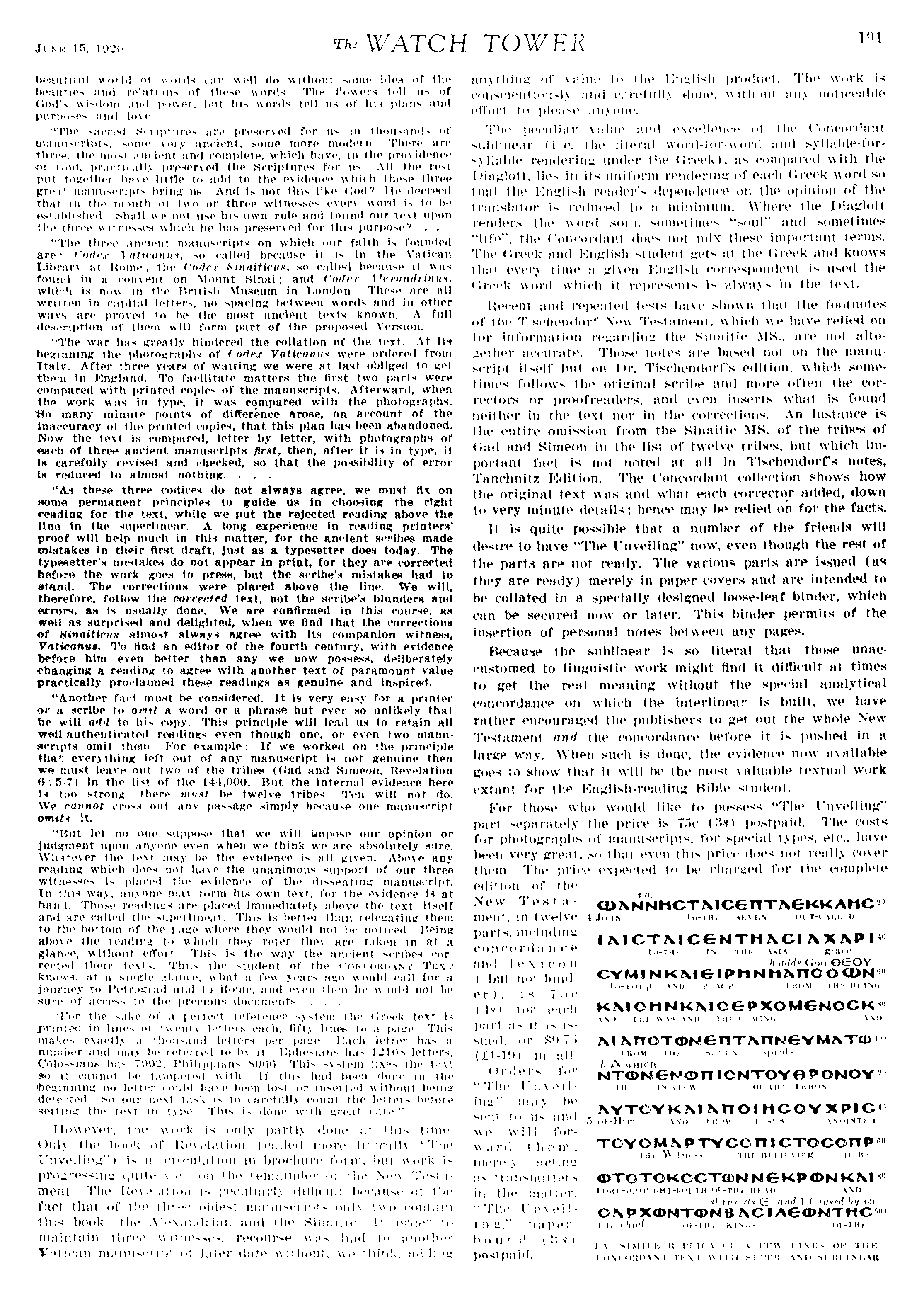 June 15, 1920 benutitul werkd af words can well do without some idea of the beauties ind relations of fhese words The flowers tell us of rods wisder and power, bat his words tell us of his plans ani purposes and love “The sacred Seriptures are preserved for us am thousands of Matiscripts, some very ancient, some more modern There are three, the nest ancient and complete, whieh have, in the providence fof God, practiealhs preserved the Seriptures for us. Alb the rest put fogether have dittle to add to the evidence which these three grevoonanuseripts bring us And is not this like God”? He decreed thar in the month ot two or three witnesses every word is to be established Shall we not tise his own rule and found our text upon the three witnesses which he liu preserved for this purpose’. “The three ancient manuscripts on which our faith is founded are: Coder Vaticunus, so called because it is in’ the Vatican Library at Reme, the Coder Sinaiticws, so called because it was found ino a convent on Mount Sinai; and Cader Alerandrinus, which is now in the British Museum in London These are all written in enpital letters, no spacing between words and in other ways are proved to be the most ancient texts known, A full description of them will form part of the proposed Version. “The war has greatly hindered the collation of the text. Af Its begruning the photographs of Coder Vaticanus were ordered from Italy. After three years of waiting we were at last obliged to get then in England. To facilitate matters the first two parts were eonpared with printed copies of the manuscripts. Afterward, when the work was in type, it was eompared with the photographs, ‘So many minute points of difference arose, on account of the inaccuracy of the printed copies, that this plan has been abandoned. Now the text is compared, letter by letter, with photographs of each of three ancient manuscripts firat, then, after it is in type, it ta carefully revised and checked, so that the possibility of error in reduced to almost nothing. . . . “Ags these three codices do not always agree, we must fix on some permanent principles to guide tus in choosing the right reading for the text, while we put the rejected reading above the Mao in the superiinear. A long experience in reading printers’ proof will help much in this matter, for the ancient scribes made miytakes in their first draft, just as a typesetter does today. The typesetter’s mistakes do not appear in print, for they are corrected before the work goes to press, but the scribe’y mistakes had to stand. The corrections were placed above the line. We will, therefore, follow the corrected text, not the seribe’s blunders and errors, as is usually done. We are confirmed in this course, as well as surprived and delighted, when we find that the corrections of Ninaiticus almost always agree with its companion witness, Vaticanus. Vo fad an editor of the fourth century, with evidence before him even better than any we now poxsens, delHberately changing a reading to agree with another text of paramount value practically proclatmed these readings as genuine and inspired. “Another fact must be considered. It ls very easy for a printer or a seribe to ont a word or a phrase but ever so unlikely that be will add to his copy. This principle will lead us to retain all well-authenticated readings even though one, or even two manuaeripts omit them For example: Ef we worked on the principle that everything feft out of any manuscript is not gennine then we must leave out two of the tribes (Gad and Simeon, Revelation 6:5-7) In the list of the 144,000, But the internal evidence here fa too strony there muat be twelve tribes Ten will not do. We cannot cross out any passage simply beeause one manuscript omsty it. “But let no one suppose that we will impose one opinion or judgment upon anyone even when we think we are absolutely sure. Whatever the text may be the evidence is all given. Above any reading which does not have the unanimous support of our three Witnesses is placed the evidence of the dissenting manuscript. Tn this was, enyene mas form his own text, for the evidence is at hand. Those readings are placed immediately above the text itself and are called the superlinear. This is better than relegating them to the bottom of the page where they would not be notived Being above the reading to which they refer they are taken in oat oa glance, without effort) This is the way the ancient seribesx cor rected ther texts. Thus the student of the Concorbane Texe knows, at a single ghinee, what a few years age would eail for oa journey to Petrograd and to iHome, and even then he would not be Sure Of aecess to the precious documents ‘Vor the sake or oa pertect reference ssstem the Grreek text is princed in lines or twenty Jetfers each, fifty Times fo a page This makes exactly oa thousand letters per pare Tach Jetter has a Nusrber and may be reterred ta by if Colossians has 7002, Philippians SO6G ‘This system fixes the teat 80 LD ealinot be tampered with If thos had been done ain the Dbezinning no letter could have been lost or mserted without bens Tephesrats bas 12008 Jetters, detected sa our next task ois te caretully count the letters betore Setting the text oi type This is done with great care” However, dhe work is oniy parti, done oat this time Only the book of Reveletion Cealled qrore literauty ¢ The Unveiting’ yy is tn ereenthition mo brechure form, but work is progressing tite The pemratheler ai thus New ment The Revelifioa i peculrarh datheudy hecatse ot the faet that of the tle ee Huse ips orbs twae Contain this book othe Alexandrian and the Sinmities Te Mivingain three wettiesses, recourse owas had ota Potrcanm mnuisceip oot hater date wathout. woe chins mdibr og vee toon Tesntvalent eter te mothe te WATCH TOWER 191 anytidnge of salie to the Pnelish product The work is cvomsereqitoushy aad: careliily ¢done. wathout any noticenble effort fo plense anrvore.