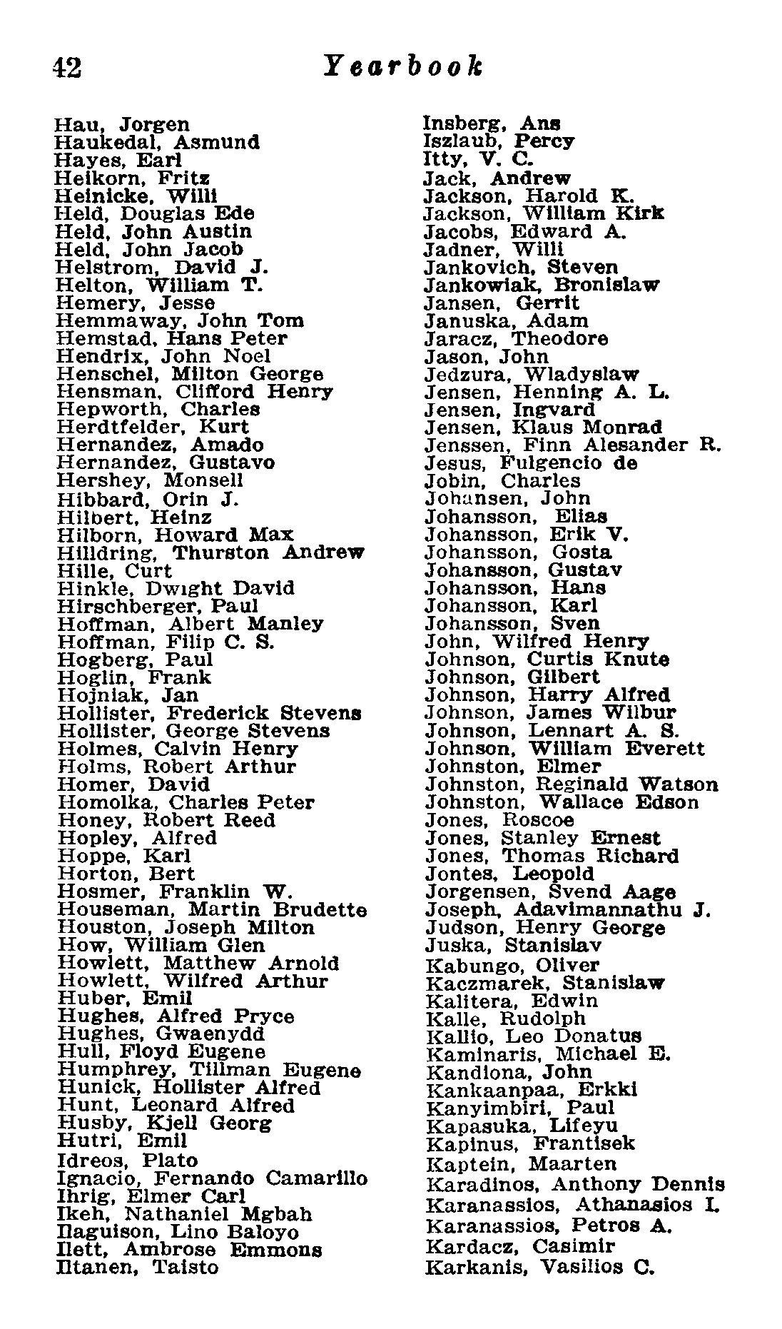 42 Yearbook Hau, Jorgen Haukedal, Asmund Hayes, Earl Heikorn, Fritz Heinicke, Willi Held, Douglas Ede Held, John Austin Held, John Jacob Helstrom, David J. Helton, William T. Hemery, Jesse Hemmaway, John Tom Hemstad, Hans Peter Hendrix, John Noel Henschel, Milton George Hensman, Clifford Henry Hepworth, Charles Herdtfelder, Kurt Hernandez, Amado Hernandez, Gustavo Hershey, Monsell Hibbard, Orin J. Hilbert, Heinz Hilborn, Howard Max Hildring, Thurston Andrew Hille, Curt Hinkle, Dwight David Hirschberger, Paul Hoffman, Albert Manley Hoffman, Filip C. 8. Hogberg, Paul Hoglin, Frank Hojniak, Jan Hollister, Frederick Stevens Hollister, George Stevens Holmes, Calvin Henry Holms, Robert Arthur Homer, David Homolka, Charles Peter Honey, Robert Reed Hopley, Alfred Hoppe, Karl Horton, Bert Hosmer, Franklin W. Houseman, Martin Brudette Houston, Joseph Milton How, William Glen Howlett, Matthew Arnold Howlett, Wilfred Arthur Huber, Emil Hughes, Alfred Pryce Hughes, Gwaenydd Hull, Floyd Eugene Humphrey, Tillman Eugene Hunick, Hollister Alfred Hunt, Leonard Alfred Husby, Kjell Georg Hutri, Emil Idreos, Plato Ignacio, Fernando Camarillo Thrig, Elmer Car} Ikeh, Nathaniel Mgbah Maguison, Lino Baloyo Ilett, Ambrose Emmons Titanen, Taisto Insberg, Ans Iszlaub, Percy Itty, V. Cc. Jack, Andrew Jackson, Harold K. Jackson, William Kirk Jacobs, Edward A. Jadner, Willi Jankovich, Steven Jankowiak, Bronislaw Jansen, Gerrit Januska, Adam Jaracz, Theodore Jason, John Jedzura, Wladyslaw Jensen, Henning A. L. Jensen, Ingvard Jensen, Klaus Monrad Jenssen, Finn Alesander R. Jesus, Fulgencio de Jobin, Charles Johansen, John Johansson, Elias Johansson, Hrik V. Johansson, Gosta Johansson, Gustav Johansson, Hans Johansson, Karl Johansson, Sven John, Wilfred Henry Johnson, Curtis Knute Johnson, Gilbert Johnson, Harry Alfred Johnson, James Wilbur Johnson, Lennart A. 8. Johnson, Willlam Everett Johnston, Elmer Johnston, Reginald Watson Johnston, Wallace Edson Jones, Roscoe Jones, Stanley Ernest Jones, Thomas Richard Jontes, Leopold Jorgensen, Svend Aage Joseph, Adavimannathu J. Judson, Henry George Juska, Stanislav Kabungo, Oliver Kaczmarek, Stanislaw Kalitera, Edwin Kalle, Rudolph Kallio, Leo Donatus Kaminaris, Michael 5. Kandiona, John Kankaanpaa, Erkki Kanyimbiri, Paul Kapasuka, Lifeyu Kapinus, Frantisek Kaptein, Maarten Karadinos, Anthony Dennis Karanassios, Athanasios I, Karanassios, Petros A, Kardacz, Casimir Karkanis, Vasilios C,