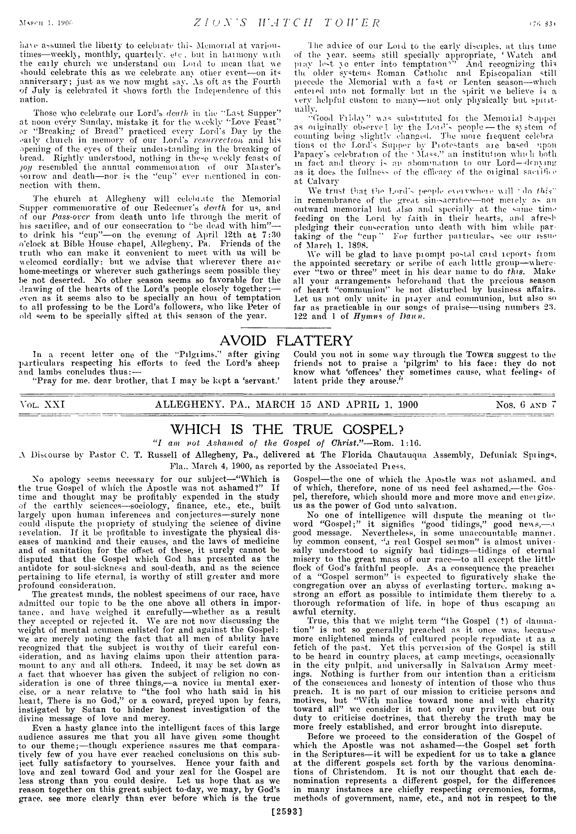 Maren 1, 1906 ZION’S nase assumed the libeity to celebrate this Memorial at variou~ times—weekl}, monthly, quarteily. eft¢. but in harmeny with the early church we understand ow Loid to mean that we should celebrate this as we celebrate an, other event—on its anniversary; just as we now might say. As oft as the Fourth of July is celebrated it shows forth the Independence of this nation, Those who celebrate our Lord’s death in te “Last Supper” at noon everv Sunday, mistake it for the weekly “Love Feast” ar “Breaking of Bread” practiced every Lord's Day by the early chuich in memory of our Lord's resurrection and his opening of the eyes of their understanding in the breaking of bread. Rightly understood, nothing in thexe weekly feasts of yoy resembled the annual commemoration of our Master's sorrow and death—nor is the “cup” ever mentioned in connection with them. The church at Allegheny will celebrate the Memorial Supper commemorative of our Redecmer’s death for us, and of our Pass-over from death unto life through the merit of his sacrifice, and of our consecration to “be dead with him’?’— to drink his “cup”’—on the evenmg of April 12th at 7:30 o'clock at Bible House chapel, Allegheny, Pa. Friends of the truth who can make it convenient to meet with us will be welcomed cordially: but we advise that wherever there are home-meetings or wherever such gatherings seem possible they he not deserted. No other season seems so favorable for the drawing of the hearts of the Lord’s people closely together ;— even as it seems also to be specially an how of temptation to all professing to be the Lord’s followers, who like Peter of old seem to be specially sifted at this season of the year. WATCH TOWER The advice of our Lond to the early disciples, at this time of the year, seems still specially appropriate, ‘Watch and pinay lest ye enter into temptation?” And recognizing this the older systems Roman Catholic and Episcopalian still precede the Memorial with a fast or Lenten season—which entered into not formally but in the spirit we believe is a very helpful custom te many—not only physically but spititually. “Good Friday” was substituted for the Memorial Supper as oiiginally observe | by the Lore’. people —the system of counting being slightly changed. The more frequent celebra tions or the Lord's Supper by Protestants aie based npon Papacy’s celebration of the * Mass.’ an instituéion which both im fact and theory is an abom nation to our Lord—-denving as it does the fullness of the efficacy of the original sacrifice at Calvary We trust that the Lord’s people everywhere will * do this” in remembrance of the great sin-saecrifice—not merely as an outward memorial but also and specially at the same time feeding on the Lord by faith in their hearts, and afresh pledging their consecration unto death with him while partaking of the Seup’' For further particular, see our issue of March 1, 1898, We will be glad to have prompt postal card 1eports from the appointed secretary or scribe of each little group—whereever “two or three” mect in his dear name to do this. Make all your arrangements heforehand that the precious season of heart “communion” be not disturbed by business affairs. Let us not only unite in prayer and communion, but also so far as practicable in our songs of praixe—using numbers 23. 122 and 1 of Hymns of Daun. AVOID FLATTERY In a recent letter one of the “Pilgiims.” after giving particulars respecting his efforts to feed the Lord’s sheep and lambs concludes thus:— “Pray for me. dear brother, that I may be kept a ‘servant.’ Could you not in some way through the Tower suggest to the friends not to praise a ‘pilgrim’ to his face: they do not know what ‘offences’ they sometimes cause, what feelings of latent pride they arouse.” Vout, XXI ALLEGHENY., PA., MARCH 15 AND APRIL 1, 1900 Nos. 6 AnD 7 WHICH IS THE TRUE GOSPEL? “IT am not Ashamed of the Gospel of Christ.”—-Rom. 1:16, -\ Discourse by Pastor C, T. Russell of Allegheny, Pa., delivered at The Florida Chautauqua Assembly, Defuniak Springs, Fla.. March 4, 1900, as reported by the Associated Press, No apology seems necessary for our subject—“Which is the true Gospel of which the Apostle was not ashamed?” If time and thought may be profitably expended in the study of the earthly sciences—sociology, finance, ete., ete., built largely upon human inferences and conjectures—surely none could dispute the propriety of studying the science of divine revelation. If it be profitable to investigate the physical diseases of mankind and their causes, and the laws of medicine and of sanitation for the offset of these, it surely cannot be disputed that the Gospel which God has presented as the antidote for soul-sickness and soul-death, and as the science pertaining to life eternal, is worthy of still greater and more profound consideration. The greatest minds, the noblest specimens of our race, have admitted our topic to be the one above all others in importance, and have weighed it carefully—whether as a result they accepted or rejected it. We are not now discussing the weight of mental acumen enlisted for and against the Gospel: we are merely noting the fact that all men of ability have recognized that the subject is woithy of their careful consideration, and as having claims upon their attention paramount to any and all others. Indeed, it may be set down as a fact that whoever has given the subject. of religion no consideration is one of three things——a novice in mental exercise, or a near relative to “the fool who hath said in his heart, There is no God,” or a coward, preyed upon by fears, instigated by Satan to hinder honest investigation of the divine message of love and mercy. Even a hasty glance into the intelligent faces of this large audience assures me that you all have given some thought to our theme;—tho