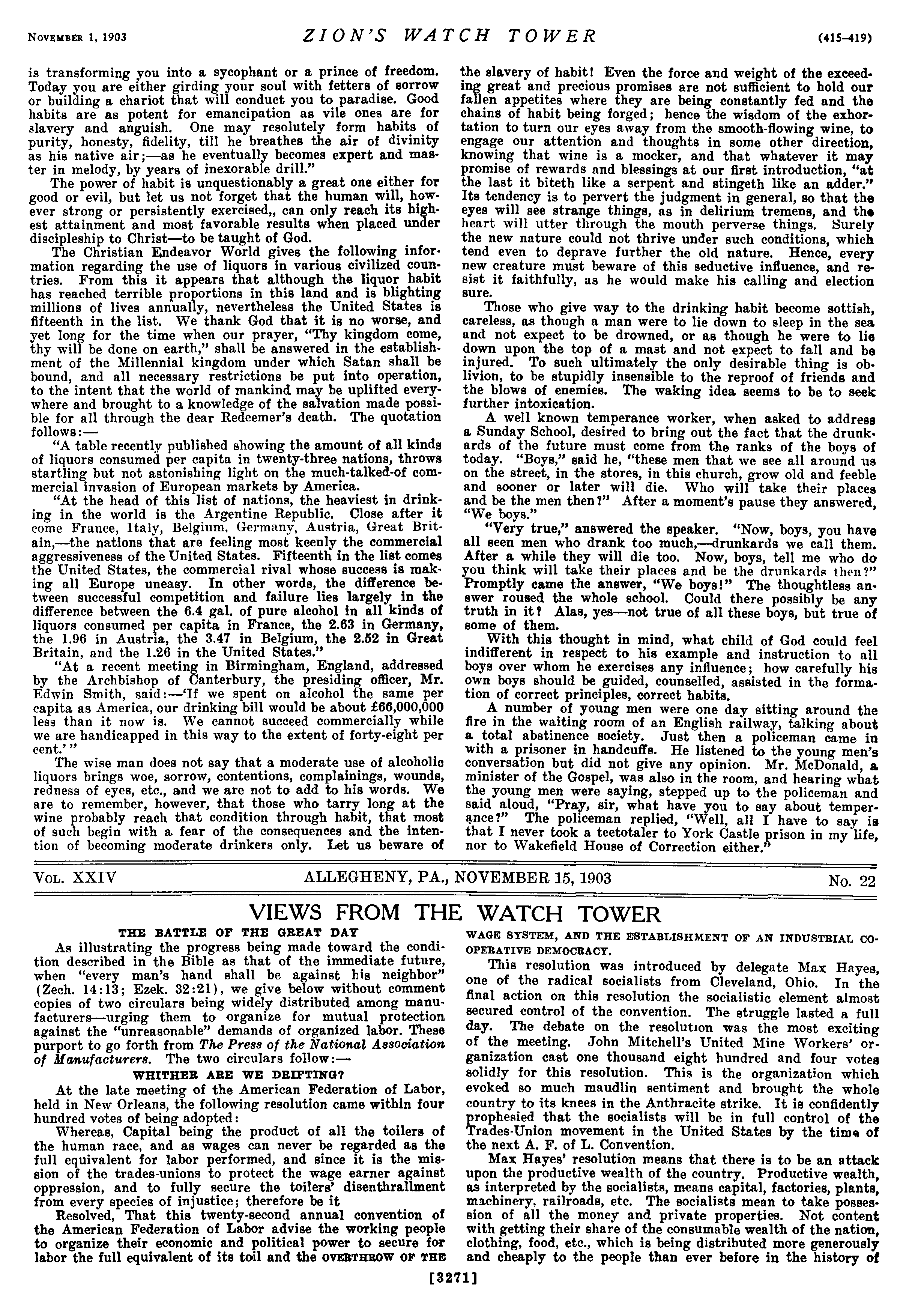 NoveMBeER 1, 1903 is transforming you into a sycophant or a prince of freedom. Today you are either girding your soul with fetters of sorrow or building a chariot that will conduct you to paradise. Good habits are as potent for emancipation ag vile ones are for slavery and anguish. One may resolutely form habits of purity, honesty, fidelity, till he breathes the air of divinity as his native air;—as he eventually becomes expert and master in melody, by years of inexorable drill.” The power of habit is unquestionably a great one either for good or evil, but let us not forget that the human will, however strong or persistently exercised,, can only reach its highest attainment and most favorable results when placed under discipleship to Christ—to be taught of God. The Christian Endeavor World gives the following information regarding the use of liquors in various civilized countries. From this it appears that although the liquor habit has reached terrible proportions in this land and is blighting millions of lives annually, nevertheless the United States is fifteenth in the list. We thank God that it is no worse, and yet long for the time when our prayer, “Thy kingdom come, thy will be done on earth,” shall be answered in the establishment of the Millennial kingdom under which Satan shall be bound, and all necessary restrictions be put into operation, to the intent that the world of mankind may be uplifted everywhere and brought to a knowledge of the salvation made possible for all through the dear Redeemer’s death. The quotation follows:— “A table recently published showing the amount of all kinds of liquors consumed per capita in twenty-three nations, throws startling but not astonishing light on the much-talked-of commercial invasion of European markets by America. “At the head of this list of nations, the heaviest in drinking in the world is the Argentine Republic. Close after it come France, Italy, Belgium, Germany, Austria, Great Britain,—the nations that are feeling most keenly the commercial ageressiveness of the United States. Fifteenth in the list comes the United States, the commercial rival whose success is making all Europe uneasy. In other words, the difference between successful competition and failure lies largely in the difference between the 6.4 gal. of pure alcohol in all kinds of liquors consumed per capita in France, the 2.63 in Germany, the 1.96 in Austria, the 3.47 in Belgium, the 2.52 in Great Britain, and the 1.26 in the United States.” “At a recent meeting in Birmingham, England, addressed by the Archbishop of Canterbury, the presiding officer, Mr. Edwin Smith, said:—‘If we spent on alcohol the same per capita as America, our drinking bill would be about £66,000,000 less than it now is. We cannot succeed commercially while we are handicapped in this way to the extent of forty-eight per cent.’ ” The wise man does not say that a moderate use of alecholic liquors brings woe, sorrow, contentions, complainings, wounds, redness of eyes, etc., and we are not to add to his words. We are to remember, however, that those who tarry long at the wine probably reach that condition through habit, that most of such begin with a fear of the consequences and the intention of becoming moderate drinkers only. Let us beware of ZION’S WATCH TOWER (415-419) the slavery of habit! Even the force and weight of the exceeding great and precious promises are not sufficient to hold our fallen appetites where they are being constantly fed and the chains of habit being forged; hence the wisdom of the exhortation to turn our eyes away from the smcoth-flowing wine, to engage our attention and thoughts in some other direction, knowing that wine is a mocker, and that whatever it may promise of rewards and blessings at our first introduction, “at the last it biteth like a serpent and stingeth like an adder.” Its tendency is to pervert the judgment in general, so that the eyes will see strange things, as in delirium tremens, and the heart will utter through the mouth perverse things. Surely the new nature could not thrive under such conditions, which tend even to deprave further the old nature. Hence, every new creature must beware of this seductive influence, and resist it faithfully, as he would make his calling and election sure. Those who give way to the drinking habit become sottish, careless, as though a man were to lie down to sleep in the sea and not expect to be drowned, or as though he were to lie down upon the top of a mast and not expect to fall and be injured. To such ultimately the only desirable thing is oblivion, to be stupidly insensible to the reproof of friends and the blows of enemies. The waking idea seems to be to seek further intoxication. A well known temperance worker, when asked to address a Sunday School, desired to bring out the fact that the drunkards of the future must come from the ranks of the boys of today. “Boys,” said he, “these men that we see all around us on the street, in the stores, in this church, grow old and feeble and sooner or later will die. Who will take their places and be the men then?” After a moment’s pause they answered, “We boys.” “Very true,” answered the speaker. “Now, boys, you have all seen men who drank too much,—drunkards we call them. After a while they will die too. Now, boys, tell me who do you think will take their places and be the drunkards then?” Promptly came the answer, “We boys!” The thoughtless answer roused the whole school. Could there possibly be any truth in it? Alas, yes—not true of all these boys, but true of some of them. . With this thought in mind, what child of God could feel indifferent in respect to his example and instruction to all boys over whom he exercises any influence; how carefully his own boys should be guided, counselled, assisted in the formation of correct principles, correct habits, A number of young men were one day sitting around the fire 
