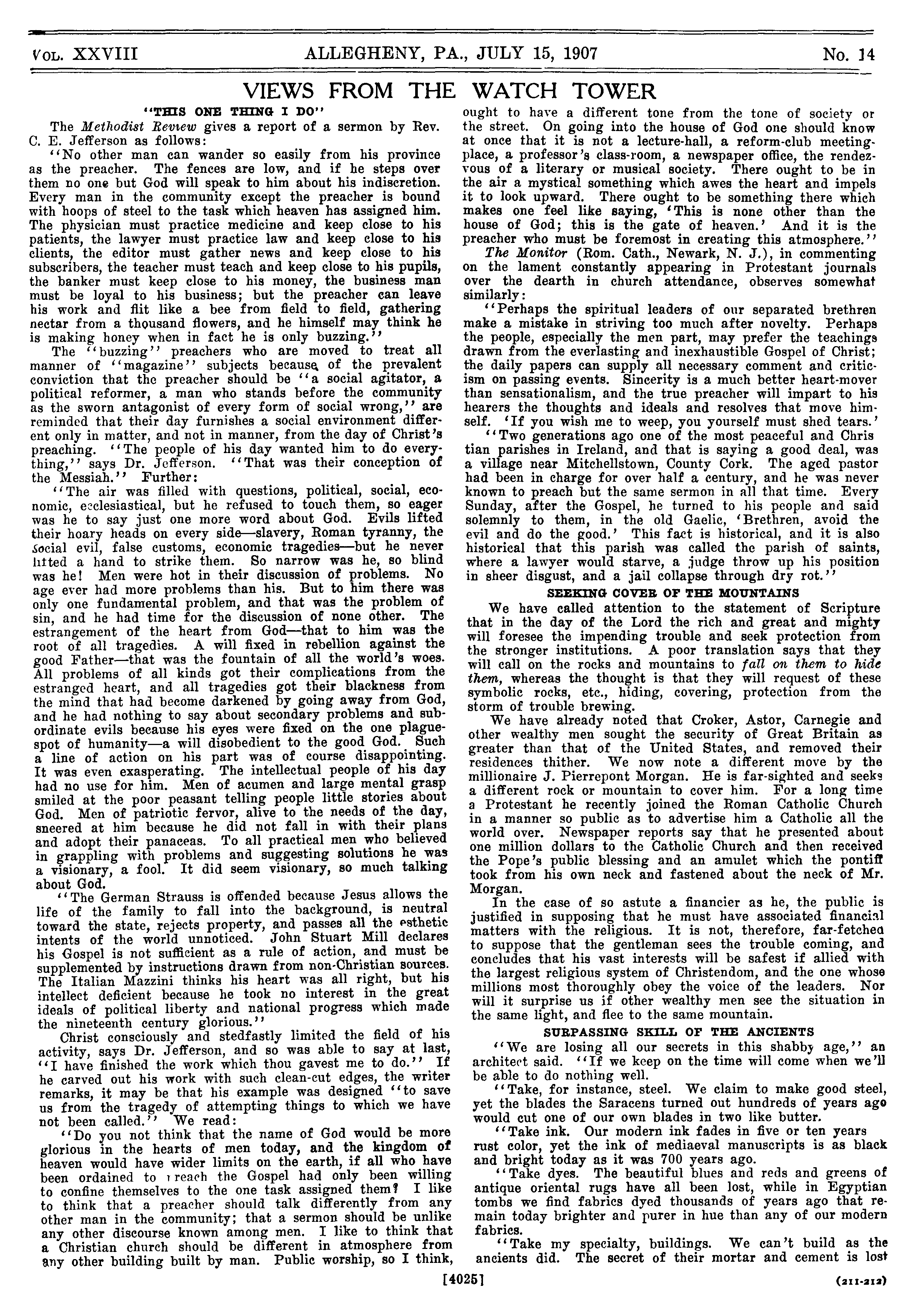 Vov. XXVIII ALLEGHENY, PA., JULY 15, 1907 No. 14 VIEWS FROM THE WATCH TOWER “THIS ONE THING I DO’’ The Methodist Review gives a report of a sermon by Rev. C. E. Jefferson as follows: ‘‘No other man can wander so easily from his province as the preacher. The fences are low, and if he steps over them no one but God will speak to him about his indiscretion. Every man in the community except the preacher is bound with hoops of steel to the task which heaven has assigned him. The physician must practice medicine and keep close to his patients, the lawyer must practice law and keep close to his clients, the editor must gather news and keep close to his subscribers, the teacher must teach and keep close to his pupils, the banker must keep close to his money, the business man must be loyal to his business; but the preacher can leave his work and flit like a bee from field to field, gathering nectar from a thousand flowers, and he himself may think he is making honey when in fact he is only buzzing.’’ The ‘‘buzzing’’ preachers who are moved to treat all manner of ‘‘magazine’’ subjects because of the prevalent conviction that the preacher should be ‘‘a social agitator, a political reformer, a man who stands before the community as the sworn antagonist of every form of social wrong,’’ are reminded that their day furnishes a social environment different only in matter, and not in manner, from the day of Christ’s preaching. ‘‘The people of his day wanted him to do everything,’’ says Dr, Jefferson. ‘‘That was their conception of the Messiah.’’? Further: ‘¢The air was filled with questions, political, social, economic, ecclesiastical, but he refused to touch them, so eager was he to say just one more word about God. Evils lifted their hoary heads on every side—slavery, Roman tyranny, the Social evil, false customs, economie tragedies—but he never htted a hand to strike them. So narrow was he, so blind was he! Men were hot in their discussion of problems. No age ever had more problems than his. But to him there was only one fundamental problem, and that was the problem of sin, and he had time for the discussion of none other. The estrangement of the heart from God—that to him was the root of all tragedies. A will fixed in rebellion against the good Father—that was the fountain of all the world’s woes. All problems of all kinds got their complications from the estranged heart, and all tragedies got their blackness from the mind that had become darkened by going away from God, and he had nothing to say about secondary problems and subordinate evils because his eyes were fixed on the one plaguespot of humanity—a will disobedient to the good God. Such a line of action on his part was of course disappointing. It was even exasperating. The intellectual people of his day had no use for him. Men of acumen and large mental grasp smiled at the poor peasant telling people little stories about God. Men of patriotic fervor, alive to the needs of the day, sneered at him because he did not fall in with their plans and adopt their panaceas. To all practical men who believed in grappling with problems and suggesting solutions he was a visionary, a fool. It did seem visionary, so much talking about God. ‘The German Strauss is offended because Jesus allows the life of the family to fall into the background, is neutral toward the state, rejects property, and passes all the esthetic intents of the world unnoticed. John Stuart Mill declares his Gospel is not sufficient as a rule of action, and must be supplemented by instructions drawn from non-Christian sources. The Italian Mazzini thinks his heart was all right, but his intellect deficient because he took no interest in the great ideals of political liberty and national progress which made the nineteenth century glorious.’’ . Christ consciously and ste@fastly limited the field of his activity, says Dr. Jefferson, and so was able to say at last, ‘‘T have finished the work which thou gavest me to do.’’ If he carved out hig work with such clean-cut edges, the writer remarks, it may be that his example was designed ‘‘to save us from the tragedy of attempting things to which we have not been called.’? We read: “‘Do you not think that the name of God would be more glorious in the hearts of men today, and the kingdom of heaven would have wider limits on the earth, if all who have been ordained to 1reach the Gospel had only been willing to confine themselves to the one task assigned them? I like to think that a preacher should talk differently from any other man in the community; that a sermon should be unlike any other discourse known among men. I like to think that a Christian church should be different in atmosphere from any other building built by man. Public worship, so I think, [4025] ought to have a different tone from the tone of society or the street. On going into the house of God one should know at once that it is not a lecture-hall, a reform-club meetingplace, a professor’s class-room, a newspaper office, the rendezvous of a literary or musical society. There ought to be in the air a mystical something which awes the heart and impels it to look upward. There ought to be something there which makes one feel like saying, ‘This is none other than the house of God; this is the gate of heaven.’ And it is the preacher who must be foremost in creating this atmosphere.’’ The Monitor (Rom. Cath., Newark, N. J.), in commenting on the lament constantly appearing in Protestant journals over the dearth in church attendance, observes somewhat similarly: ‘*Perhaps the spiritual leaders of our separated brethren make a mistake in striving too much after novelty. Perhaps the people, especially the men part, may prefer the teachings drawn from the everlasting and inexhaustible Gospel of Christ; the daily papers can supply all necessary comment and criticism on passing events. Since