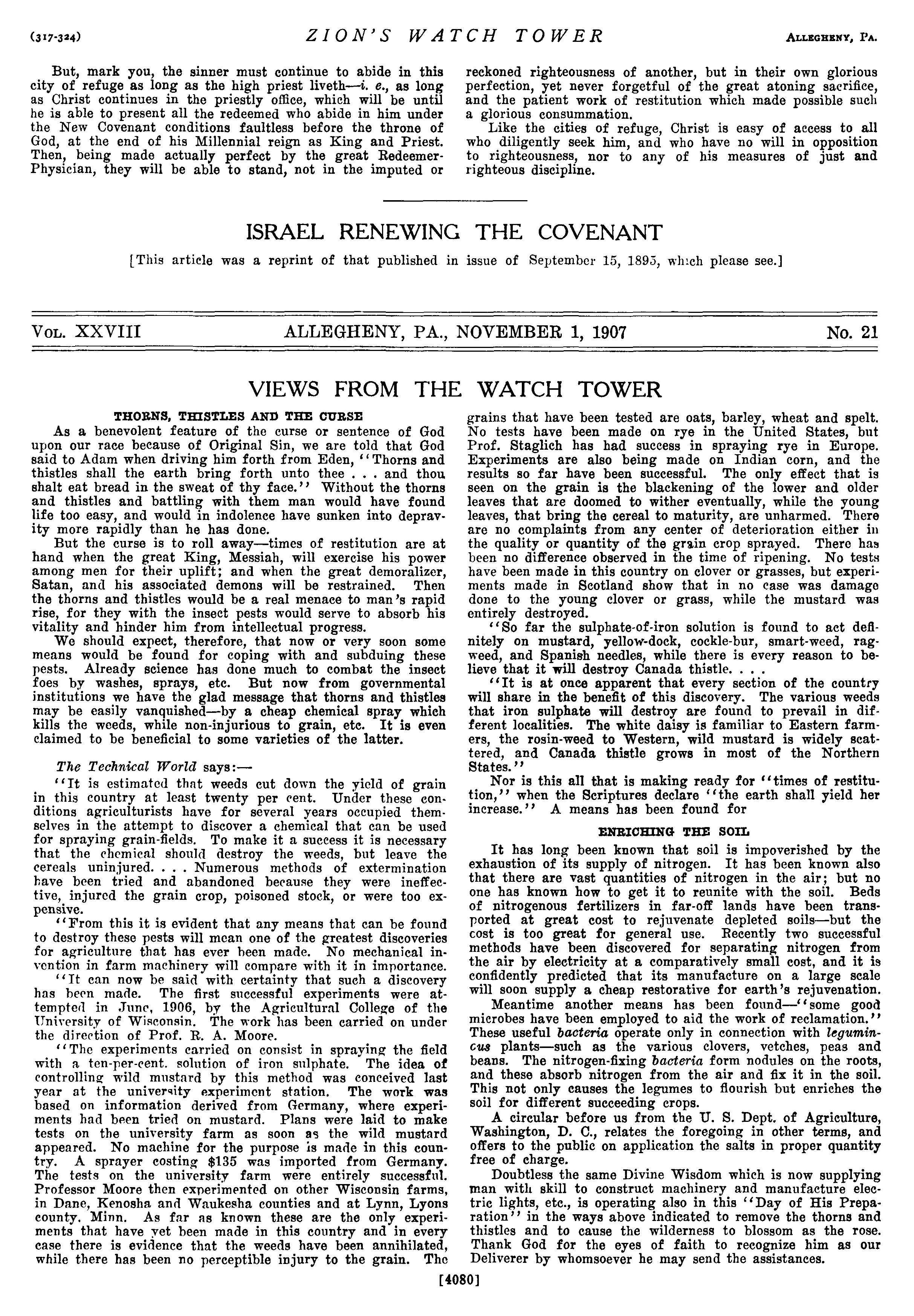 (317-324) But, mark you, the sinner must continue to abide in this city of refuge as long as the high priest liveth—i. ¢., as long as Christ continues in the priestly office, which will be until he is able to present all the redeemed who abide in him under the New Covenant conditions faultless before the throne of God, at the end of his Millennial reign as King and Priest. Then, being made actually perfect by the great RedeemerPhysician, they will be able to stand, not in the imputed or ZION’S WATCH TOWER ALLEGHENY, Pa. reckoned righteousness of another, but in their own glorious perfection, yet never forgetful of the great atoning sacrifice, and the patient work of restitution which made possible such a glorious consummation. Like the cities of refuge, Christ is easy of access to all who diligently seek him, and who have no will in opposition to righteousness, nor to any of his measures of just and righteous discipline. ISRAEL RENEWING THE COVENANT [This article was a reprint of that published in issue of September 15, 1895, which please see.] Vou. XXVIII ALLEGHENY, PA., NOVEMBER 1, 1907 No. 21 VIEWS FROM THE WATCH TOWER THORNS, THISTLES AND THE CURSE As a benevolent feature of the curse or sentence of God upon our race because of Original Sin, we are told that God said to Adam when driving him forth from Eden, ‘‘ Thorns and thistles shall the earth bring forth unto thee ... and thou shalt eat bread in the sweat of thy face.’’ Without the thorns and thistles and battling with them man would have found life too easy, and would in indolence have sunken into depravity more rapidly than he has done. But the curse is to roll away—times of restitution are at hand when the great King, Messiah, will exercise his power among men for their uplift; and when the great demoralizer, Satan, and his associated demons will be restrained. Then the thorns and thistles would be a real menace to man’s rapid rise, for they with the insect pests would serve to absorb his vitality and hinder him from intellectual progress. We should expect, therefore, that now or very soon some means would be found for coping with and subduing these pests. Already science has done much to combat the insect foes by washes, sprays, etc. But now from governmental institutions we have the glad message that thorns and thistles may be easily vanquished—by a cheap chemical spray which kills the weeds, while non-injurious to grain, ete. It is even claimed to be beneficial to some varieties of the latter. The Technical World says:— ‘*It is estimated that weeds cut down the yicld of grain in this country at least twenty per cent. Under these conditions agriculturists have for several years occupied themselves in the attempt to discover a chemical that can be used for spraying grain-fields, To make it a success it is necessary that the chemical should destroy the weeds, but leave the cereals uninjured. ... Numerous methods of extermination have been tried and abandoned because they were ineffective, injured the grain crop, poisoned stock, or were too expensive. ‘‘From this it is evident that any means that can be found to destroy these pests will mean one of the greatest discoveries for agriculture that has ever heen made. No mechanical invention in farm machinery will compare with it in importance. ‘¢Tt can now be said with certainty that such a discovery has been made. The first successful experiments were attempted in Junc, 1906, by the Agricultural College of the University of Wisconsin. The work has been earried on under the direction of Prof. R. A. Moore. ‘‘The experiments carried on consist in spraying the field with a ten-per-cent. solution of iron sulphate, The idea of controlling wild mustard by this method was conceived last year at the university experiment station. The work was based on information derived from Germany, where experiments had been tried on mustard. Plans were laid to make tests on the university farm as soon as the wild mustard appeared. No machine for the purpose is made in this country. <A sprayer costing $135 was imported from Germany. The tests on the university farm were entirely successful. Professor Moore then experimented on other Wisconsin farms, in Dane, Kenosha and Waukesha counties and at Lynn, Lyons county. Minn. As far as known these are the only experiments that have vet been made in this country and in every ease there is evidence that the weeds have been annihilated, while there has been no perceptible injury to the grain. The grains that have been tested are oats, barley, wheat and spelt. No tests have been made on rye in the United States, but Prof. Staglich has had success in spraying rye in Europe. Experiments are also being made on Indian corn, and the results so far have been successful. The only effect that is seen on the grain is the blackening of the lower and older leaves that are doomed to wither eventually, while the young leaves, that bring the cereal to maturity, are unharmed. There are no complaints from any center of deterioration either in the quality or quantity of the grain crop sprayed. There has been no difference observed in the time of ripening. No tests have been made in this country on clover or grasses, but experiments made in Scotland show that in no case was damage done to the young clover or grass, while the mustard was entirely destroyed. ‘*So far the sulphate-of-iron solution is found to aet definitely on mustard, yellow-dock, cockle-bur, smart-weed, ragweed, and Spanish needles, while there is every reason to believe that it will destroy Canada thistle. . . ‘*It is at once apparent that every section of the country will share in the benefit of this discovery. The various weeds that iron sulphate will destroy are found to prevail in different localities. The white daisy is familiar to Eastern farmers, the rosin-weed to Western, wild mustard is widely scattered, and Canada thistle grows in most of the Northern States. ’’ 