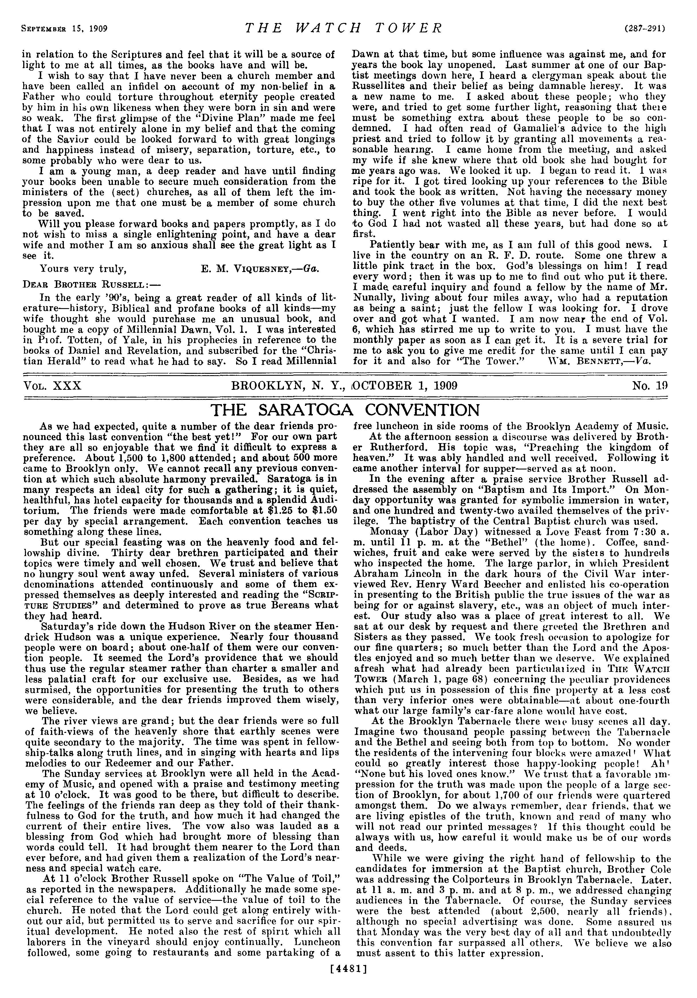 SEPTEMBER 15, 1909 in relation to the Scriptures and feel that it will be a source of light to me at all times, as the books have and will be. I wish to say that I have never been a church member and have been called an infidel on account of my non-belief in a Father who could torture throughout eternity people created by him in his own likeness when they were born in sin and were so weak. The first glimpse of the “Divine Plan” made me feel that I was not entirely alone in my belief and that the coming of the Savior could be looked forward to with great longings and happiness instead of misery, separation, torture, etc., to some probably who were dear to us. I am a young man, a deep reader and have until finding your books been unable to secure much consideration from the ministers of the (sect) churches, as all of them left the impression upon me that one must be a member of some church to be saved. Will you please forward books and papers promptly, as I do not wish to miss a single enlightening point, and have a dear wife and mother I am so anxious shall see the great light as I see it. Yours very truly, E. M. VIQuEsNEY,—Ga. Dear BROTHER RUSSELL:— In the early ’90’s, being a great reader of all kinds of literature—history, Biblical and profane books of all kinds—my wife thought she would purchase me an unusual book, and bought me a copy of Millennial Dawn, Vol. 1. I was interested in Piof. Totten, of Yale, in his prophecies in reference to the beoks of Daniel and Revelation, and subscribed for the “Christian Herald” to read what he had to say. So I read Millennial THE WATCH TOWER (287-291) Dawn at that time, but some influence was against me, and for years the book lay unopened. Last summer at one of our Baptist meetings down here, I heard a clergyman speak about the Russellites and their belief as being damnable heresy. It was a new name to me. I asked about these people; who they were, and tried to get some further light, reasoning that there must be something extra about these people to be so condemned. I had often read of Gamaliel’s advice to the high priest and tried to follow it by granting all movements a reasonable hearing. I came home from the meeting, and asked my wife if she knew where that old book she had bought for me years ago was. We looked it up. I began to read it. I was ripe for it. I got tired looking up your references to the Bible and took the book as written. Not having the necessary money to buy the other five volumes at that time, I did the next best thing. I went right into the Bible as never before. I would to God I had not wasted all these years, but had done so at first. Patiently bear with me, as I am full of this good news. I live in the country on an R. F. D. route. Some one threw a little pink tract in the box. God’s blessings on him! IJ read every word; then it was up to me to find out who put it there. I made careful inquiry and found a fellow by the name of Mr. Nunally, living about four miles away, who had a reputation as being a saint; just the fellow I was looking for. I drove over and got what I wanted. I am now near the end of Vol. 6, which has stirred me up to write to you. I must have the monthly paper as soon as I can get it. It is a severe trial for me to ask you to give me credit for the same until I can pay for it and also for ‘The Tower.” Wm. BENNETT, Va. Vou. XXX BROOKLYN, N. Y., OCTOBER 1, 1909 No. 19 THE SARATOGA CONVENTION As we had expected, quite a number of the dear friends pronounced this last convention “the best yet!” For our own part they are all so enjoyable that we find it difficult to express a preference. About 1,500 to 1,800 attended; and about 500 more came to Brooklyn only. We cannot recall any previous convention at which such absolute harmony prevailed. Saratoga is in many respects an ideal city for such a gathering; it is quiet, healthful, has hotel capacity for thousands and a splendid Auditorium, The friends were made comfortable at $1.25 to $1.50 per day by special arrangement. Each convention teaches us something along these lines, But our special feasting was on the heavenly food and fellowship divine. Thirty dear brethren participated and their topics were timely and well chosen. We trust and believe that no hungry soul went away unfed. Several ministers of various denominations attended continuously and some of them expressed themselves as deeply interested and reading the “ScrirTURE STUDIES” and determined to prove as true Bereans what they had heard. Saturday’s ride down the Hudson River on the steamer Hendrick Hudson was a unique experience. Nearly four thousand people were on board; about one-half of them were our convention people. It seemed the Lord’s providence that we should thus use the regular steamer rather than charter a smaller and less palatial craft for our exclusive use. Besides, as we had surmised, the opportunities for presenting the truth to others were considerable, and the dear friends improved them wisely, we believe. The river views are grand; but the dear friends were so full of faith-views of the heavenly shore that earthly scenes were quite secondary to the majority. The time was spent in fellowship-talks along truth lines, and in singing with hearts and lips melodies to our Redeemer and our Father. The Sunday services at Brooklyn were all held in the Academy of Music, and opened with a praise and testimony meeting at 10 o’clock. It was good to be there, but difficult to describe. The feelings of the friends ran deep as they told of their thankfulness to God for the truth, and how much it had changed the current of their entire lives. The vow also was lauded as a blessing from God which had brought more of blessing than words could tell. It had brought them nearer to the Lord than ever before, and had given them a realization of the Lord’s nearness and special watch care. At 11 o’clock Brother Russell spoke on “The Value of Toil,” as re