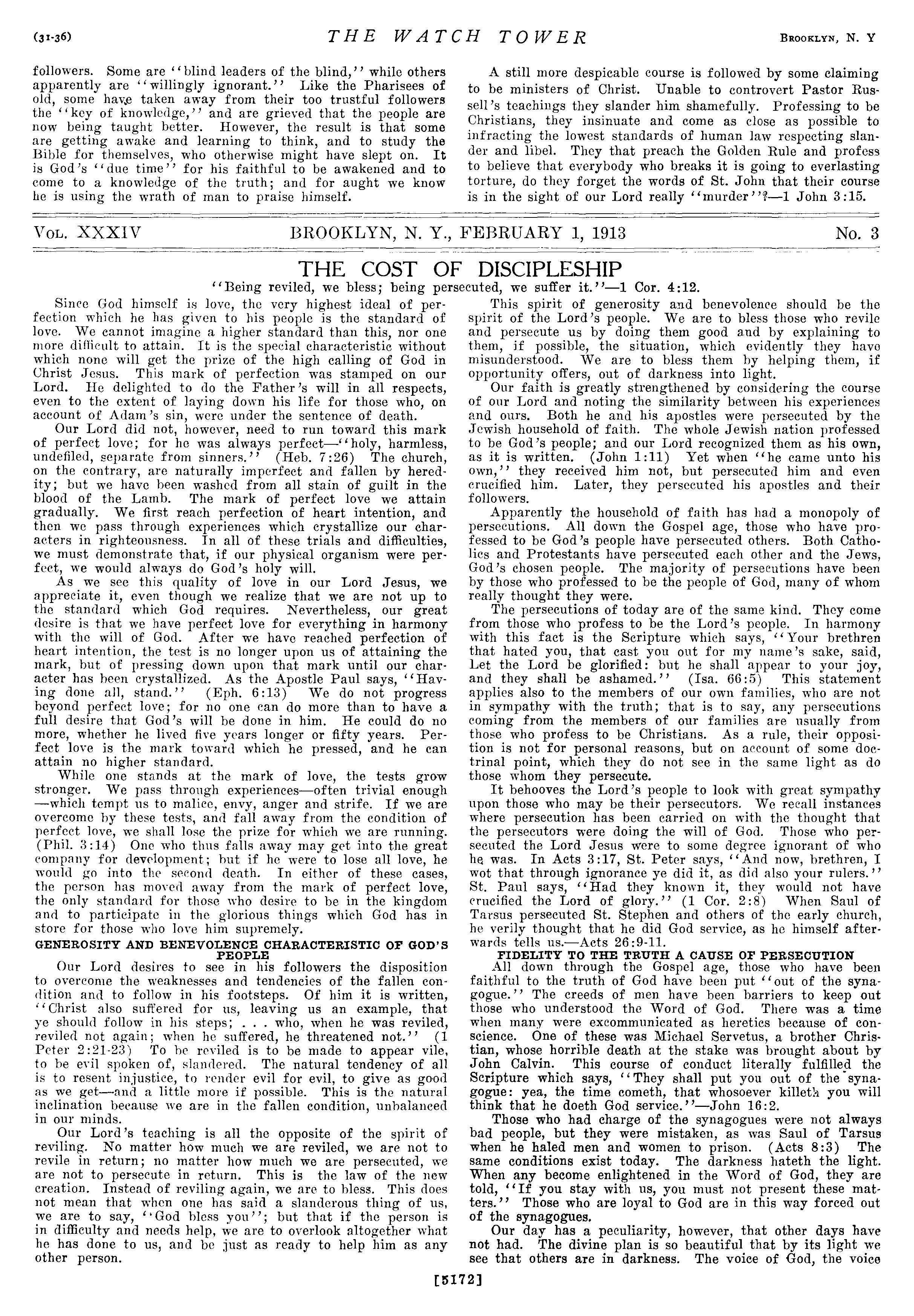 (31-36) followers. Some are ‘‘blind leaders of the blind,’’ while others apparently are ‘‘willingly ignorant.’’? Like the Pharisees of old, some have taken away from their too trustful followers the ‘‘key of knowledge,’’ and are grieved that the people are now being taught better. However, the result is that some are getting awake and learning to think, and to study the Bible for themselves, who otherwise might have slept on. It is God’s ‘‘due time’’ for his faithful to be awakened and to come to a knowledge of the truth; and for aught we know he is using the wrath of man to praise himself. THE WATCH TOWER Brooxtyn, N. Y¥ A still more despicable course is followed by some claiming to be ministers of Christ. Unable to controvert Pastor Russell’s teachings they slander him shamefully. Professing to be Christians, they insinuate and come as close as possible to infracting the lowest standards of human law respecting slander and libel. They that preach the Golden Rule and profess to believe that everybody who breaks it is going to everlasting torture, do they forget the words of St. John that their course is in the sight of our Lord really ‘‘murder’’?—1 John 3:15. Vou. XXXIV BROOKLYN, N. Y,, FEBRUARY 1, 19138 No. 3 THE COST OF DISCIPLESHIP ‘‘Being reviled, we bless; being persecuted, we suffer it.’’—1 Cor. 4:12. Since God himself is love, the very highest ideal of perfection which he has given to his people is the standard of love. We cannot imagine a higher standard than this, nor one more difficult to attain. It is the special characteristic without which none will get the prize of the high calling of God in Christ Jesus. This mark of perfection was stamped on our Lord. He delighted to do the Father’s will in all respects, even to the extent of laying down his life for those who, on account of Adam’s sin, were under the sentence of death. Our Lord did not, however, need to run toward this mark of perfect love; for he was always perfect—‘‘holy, harmless, undefiled, separate from sinners.’’?’ (Heb. 7:26) The church, on the contrary, are naturally imperfect and fallen by heredity; but we have been washed from all stain of guilt in the blood of the Lamb. The mark of perfect love we attain gradually. We first reach perfection of heart intention, and then we pass through experiences which crystallize our characters in righteousness. In all of these trials and difficulties, we must demonstrate that, if our physical organism were perfeet, we would always do God’s holy will. As we see this quality of love in our Lord Jesus, we appreciate it, even though we realize that we are not up to the standard which God requires. Nevertheless, our great desire is that we have perfect love for everything in harmony with the will of God. After we have reached perfection of heart intention, the test is no longer upon us of attaining the mark, but of pressing down upon that mark until our character has heen crystallized. As the Apostle Paul says, ‘‘Having done all, stand.’’ (Eph. 6:13) We do not progress beyond perfect love; for no one can do more than to have a full desire that God’s will be done in him, He could do no more, whether he lived five years longer or fifty years. Perfect love is the mark toward which he pressed, and he can attain no higher standard. While one stands at the mark of love, the tests grow stronger. We pass through experiences—often trivial enough —which tempt us to malice, envy, anger and strife. If we are overcome by these tests, and fall away from the condition of perfect love, we shall lose the prize for which we are running. (Phil. 3:14) One who thus falls away may get into the great company for development; but if he were to lose all love, he would go into the second death. In either of these cases, the person has moved away from the mark of perfect love, the only standard for those who desire to be in the kingdom and to participate in the glorious things which God has in store for those who love him supremely. GENEROSITY AND BENE V OTN Gn gy HARACTERISTIC OF GOD’S Our Lord desires to see in his followers the disposition to overcome the weaknesses and tendencies of the fallen condition and to follow in his footsteps. Of him it is written, ‘‘Christ also suffered for us, leaving us an example, that ye should follow in his steps; ... who, when he was reviled, reviled | not again; when he suffered, he threatened not.’’ (1 Peter 2:21-23) ‘To be reviled is to be made to appear vile, to be evil spoken of, slandered. The natural tendency of all is to resent injustice, to render evil for evil, to give as good as we get—and a little more if possible. This is the natural inclination beeause we are in the fallen condition, unbalanced in our minds. Our Lord’s teaching is all the opposite of the spirit of reviling. No matter how much we are reviled, we are not to revile in return; no matter how much we are persecuted, we are not to persecute in return. This is the law of the new creation. Instead of reviling again, we are to bless. This does not mean that when one has said a slanderous thing of us, we are to say, ‘'God bless you’’; but that if the person is in difficulty and needs help, we are to overlook altogether what he has done to us, and be just as ready to help him as any other person. This spirit of generosity and benevolence should be the spirit of the Lord’s people. We are to bless those who revile and persecute us by doing them good and by explaining to them, if possible, the situation, which evidently they have misunderstood. We are to bless them by helping them, if opportunity offers, out of darkness into light. Our faith is greatly strengthened by considering the course of our Lord and noting the similarity between his experiences and ours, Both he and his apostles were persecuted by the Jewish household of faith. The whole Jewish nation professed to be God’s people; and