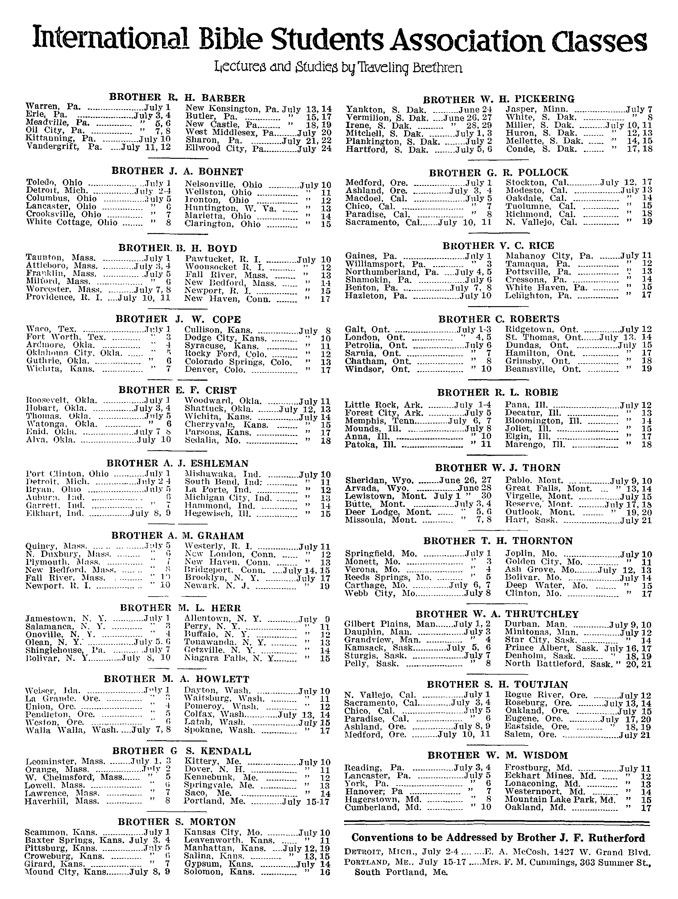 International Bible Students Association Classes Lectures and Studies by Traveling Brethren BROTHER R, Warren, Pal oo... eceeeeecee July 1 Hrie, Pa. |... July 3, 4 Meady ile, Pa, ” 6, Oil City, Pa. . 4, Kittanning, Pa, July 10 Vandergrift, Pa. ....July 11,12 BROTHER J. Toledo, Ohio July 1 Detroit, Mich. July 2-4 Columbus, Ohio : Tuly 5 Lancaster, Ohio » 6 Crooksville, Ohio » 7% White Cottage, Ohio » 8 H. BARBER New Kensington, Pa. July 13, 14 Butler, Pa. 15,17 New Castle, Pa,. .? West Middlesex, Pa. Sharon, Pa, . Ellwood City, Pa. A. BOHNET Nelsonville, Ohio _.......... July 10 Wellston, Ohio . “4d Ironton, Ohio » 12 Huntington, W. » 138 Marietta, Ohio » 44 Clarington, Ohio 15 Taunton, Mass. Attleboro, Mass. .. Franklin, Mass. Milford, Mass. . Worcester, Mass. Providenee, I. I, Pawtucket, R. I, Woonsocket R. I. Tall River, Mass. New Bedfor d, Mass. 14 Newport, Rh. L » 15 New Haven, Conn. . » 17 BROTHER J. . Waco, Tex. .... Aud Fort Worth, Tes Ardmore, Okla. .. Okla. . Oklahoma City, W. COPE Cullison, Kans, Dodge City, Kans, Syracuse, Kans. . Rocky Ford, Colo. Guthrie, Okla. . Colorado Springs, Colo. * 18 Wichita, Kans, ” Denver, Colo. 20.02.00... » 17 BROTHER E. F. CRIST Tkoosevelt, Okla. oe July] Woodward, Okla. ............ July 11 Hobart, Okla. ... July 3,4 Shattuck, Okla. . July 12, 13 Phoinas, Okla. oo... Jnty5 Wichita, "Kans. . duly 14 Watonga, Okla. we 7 6 Cherryvale, Kans. » 15 Enid, Okla, . July 7 6 Parsons, Kans. . ” IT Alva, Okla, July 10 Sedalia, Mo. . ” 18 BROTHER A. J. ESHLEMAN Tort Clinton, Ohio -... July 1 Mishawaka, Ind. Detroit, Mich. .. July 2+ South Bend, Ind: 11 Bryan, Ohio .. July 5 la Porte, Ind. ..... » 12 Auburn. Ind. +} Michigan City, Ind "438 Garrett, Ind. UT Hammond, Ind. 7 4 Kikhart, Ind, July 8, 9 Hegewisch, Oh. ” 15 BROTHER A. M. GRAHAM Quincy, Mass. .... - vely 5 Westerly, R. Bo Jaly 11 N. Duxbury, Mai . § New London, Conn, ...... 12 Piymouth, Mass, * i New Haven, Conn. New Bedford, Mas * 8 Bridgeport, Conn, Fall River, Mass. 19 Brooklyn, N.Y. Newport, R. 1, 10 Newark, N. J. BROTHER M. L. HERR Jamestown, N.Y. ...- yi Allentown, N. Y. July 9 Salamanca, N. Y. ‘ 3 Perry, N.Y. 1 Onoville, N.Y. " Buffalo, N. Y. ” 412 Olean, N. Y. Tonawanda, N ” 18 Shinglehouse, Getaville, N. » 14 Bolivar, N. Y July 8, Niagara Falls, N. » 15 BROTHER M. A. HOWLETT Weiser, Ida. 220-2222... gvly 1 Dayton, Wash. July 10 La Grande, Ore. . . 7 4 Waitsburg, Wash. vd Union, Ore. ........ “+ Pomeroy, Wash. "12 Pendleton, Ore. "5 Colfax, Wash... Wesion, Ore. § Latah, Wash. Walla Walla, Wash. ...July 7,8 Spokane, Wash. . BROTHER G S. KENDALL Leominster, Mass. -....... July 1,3 Kittery, Me. . Orange, Mass. ......-. Jvly 2. Dover, N. H. . 1 W. Chelmsford, Mass. , 5 Kennebunk, Me. » 12 Lowell. Mass. .... "6 Springvale, Me, . ” 13 Lawrence, Mass. " 7 Saco, Me... ” 14 Haverhill, Mass. ” §8 Portland, Me. . July 15-17 BROTHER S. MORTON Scammon, Kans. .......-....---- July1 Kansas City, Mo. 00202... July 10 Baxter Springs, Kans. July 3, 4 Leavenworth, Kans, ...... i1 Pittsburg, Kans. ..... July 5 Manhattan, Kans. ....July 12, 19 Croweburg, Kans. Salina, Kans. ..... » 13 Girard, Kans, Mound City, Kans. Gypsum, Kans, . Solomon, Kans. BROTHER W. H. PICKERING Yankton, S. Dak. .......... June 2+ Vermilion, 8. Dak. _.June 26, 27 Irene, S. Dak, » 28, Mitchell, S. Dak. July 1,3 Plankington, §. Dak. July 2 Hartford, 8S. Dak. ....-... July 5, 6 Jasper, Minn. White, 8. Dak, . Miller, 8. Dak. Huron, $3. Dak. - 2 Mellette, 8. Dak. 14,15 Conde, 8. Dak. ” 17,18 BROTHER G. R. POLLOCK Medford, Ore. .... Ashland, Ore. Macdoel, Cal. . Chico, Cal. ... Paradise, Cal, Sacramento, Cal.. _ 8 July 10, 11 BROTHER V. Gaines, Pa. Williamsport, Pa. Northumberland, Pa. Shamokin, Pa. Benton, Pa. .. Hazleton, Pa. Stockton, Cal... Modesto, Cal. Oakdale, Cal. . July 12, 17 - duly Tuolumne, Cal. ” is Richmond, Cal. . » 18 N. Vallejo, Cal. . » 19 Cc. RICE Mahanoy City, Pa. BROTHER C. ROBERTS Galt, Ont. London, Ont. Petrolia, Ont. Sarnia, Ont. . Chatham, Ont. Windsor, Ont. ... Tamaqua, Pa, - 12 Pottsville, Pa. 2 13 Cressona, Pa. .. » 14 White Haven, Pa - 7 16 Lehighton, Pa. _ "7 17 Ridgetown, Ont. neeeceeeeeeeee July 12 we July 18, 14 Dundas, Ont, July 15 Hamilton, Ont, - 7% AT Grimsby, Ont. » 18 Beamsyv ille, Ont. » 19 BROTHER R. L. ROBIE Little Rock, Ark. . Forest City, Ark. Memphis, Tenn. Mounds, IH. Anna, Ill, . Patoka, Tl. -.. Pana, Ill. Decatur, Ill . 13 Bloomington, Ill. 414 Joliet, Ill. ... - ? 15 Elgin, Tl, .. _" 17 Marengo, Ml. » 18 BROTHER W. J. THORN Sheridan, Wyo. June 26, 27 Arvada, Wyo. ... June 28 Lewistown, Mo: y1” 30 Butte, Mont. . July 3,4 Deer Lodge, Mont. . "5,6 Missoula, Mont. ........-... » 7,8 BROTHER T. Springfield, Mo. Monett, Mo. Verona, Mo. Reeds Springs, Carthage, Mo. Webb City, Mo.... . July 1b 2” 3 Mo. Gilbert Plains, Man.. Dauphin, Man, .. Grandview, Man. Kamsack, ‘Sask. Sturgis, Sask. Pelly, Sask. Pablo. Mont. ... Great Falls, Mo. Virgelle, Mont, Reserve,’ Mont. Outlook, Moni. Hart, Sask. H. THORNTON Joplin, Mo. see Golden City, Mo. a Ash Grove, Mo.. July 12, 13 Bolivar, Mo. July 14 Deep Water, 7 15 5 Clinton, Mo. wee 7 1F A. THRUTCHLEY Durban, Man, _0.0.0000.... July 9: 10 Minitonas, Man. Star City, Sask. Prince Albert, Sask. July 16,17 Denholm, Sask. 18,19 North Battleford, Sask.” 20, 21 BROTHER 8. H. TOUTJIAN N. Vallejo, Cal. Sacramento, Cal Chico, Cal. ...... Paradise, Cal. - 7 6 Ashland, Ore. . July 8, 9 Medford, Ore. .. July 10, 11 BROTHER W. Reading, Lancaster, York, Pa. ..... 6 Hanover; Pa ... 7 Hagerstown, Md. " 8 Cumberland, Md. ” 10 Rogue River, Ore. Roseburg, Ore, _.. Oakland, Ore. Bugene, Ore. Hastside, Ore, Salem, Ore. eeeeeeeeee July 12 July 13, i M. WISDOM Frostburg, Md, —...02..0..... July 11 Eckhart Mines, Md. 12 Lonaconing, Md. ... * 13 Westernport, Md. . .~ * 14 Mountain Lake Park, Md. ” 15 Oakland, Md... ” 17 Conventions to be Addressed by Brother J. F. Rutherford Detroit, Micn., July 2-4 .... .... FB. A. M